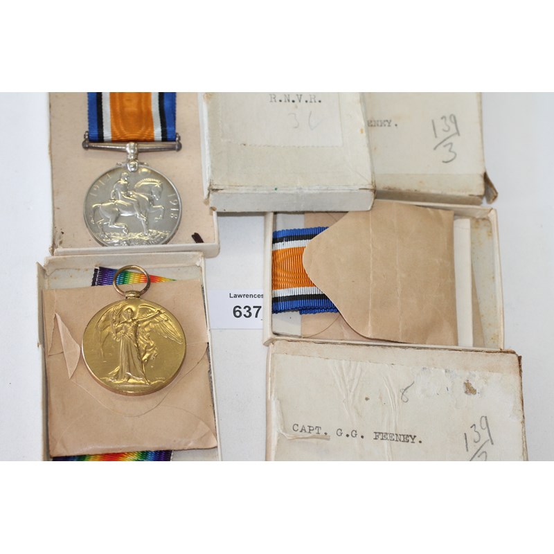 British War & Victory Medals named to Capt G G Feeney, in boxes of issue. Gilbert Grace Feeney served in France from the 5th February 1917 as a 2/Lt then later as a Captain (T/Major).