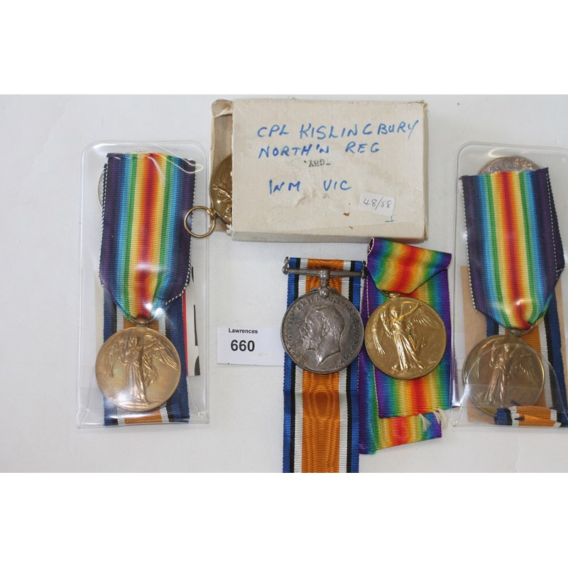 British War & Victory Medals named to 1. 12680 Cpl P W Kislingbury North'n Regt. ( Percy W) 2. 266346 Pte H Moody North'd Fus. Harry Moody Died of Wounds received 8/10/1917, whilst serving with the 8th Battalion N-Fusiliers. The son of Hannah Moody of Cranswick Beverley aged 41 years. Buried in Mendinghem Military Cemetery. Belgium. 3. 31127 Pte F Summers S .Lancs.R. (Frank) enlisted 9/12/1915 and was invalided out (Wounds) 28/3/1917. Silver War Badge List J506 under Para 392-XV1. 4. 3194 Pte I Mattinson N Staffs R. (Isaac) served in his Regiment then the Labour Corps under number 439451. He was awarded a Silver War Badge under List LC/4646.