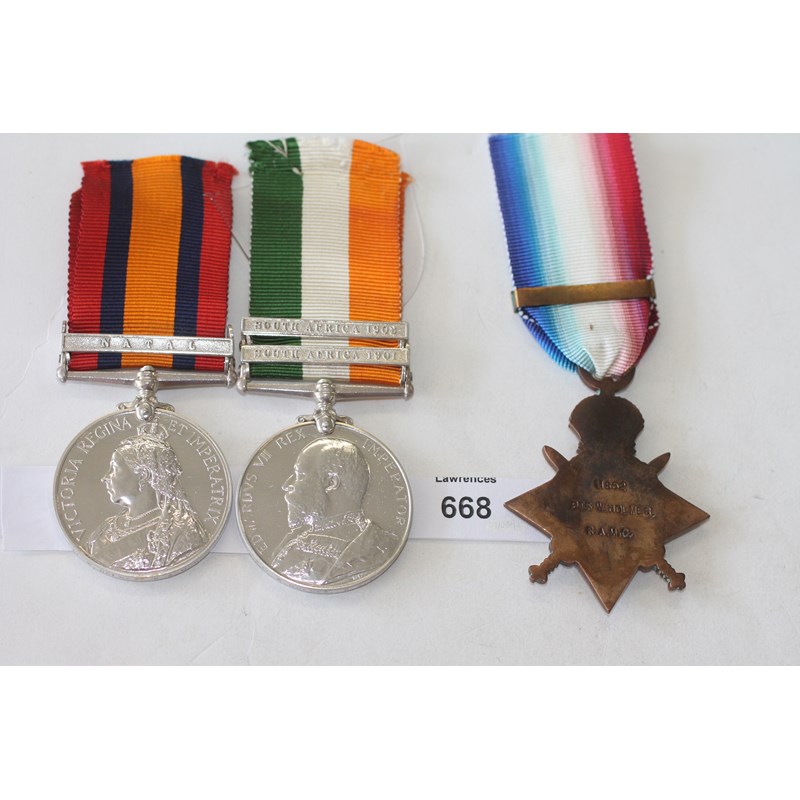 A Queens South Africa Medal with bar Natal,. A Kings South Africa Medal with bars South Africa 1901 & 1902, both named to 11852 Pte W Holmes R.A.M.C. A 1914 Star with sliding bar, named to 11852 Pte W Holmes R.A.M.C. (Walter) served in France, from the 12th September 1914. (17th Field Ambulance) Awarded a Clasp and Roses 80493 list.
