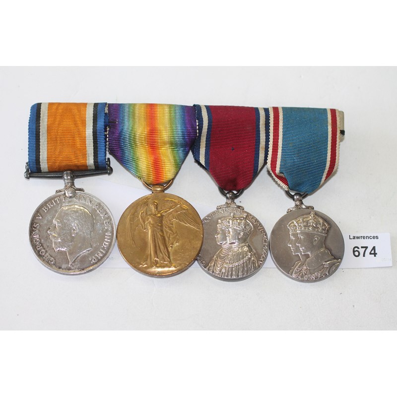 Mounted for wear a group of four medals, including a Gt War pair. British War & Victory Medals named to P-5360 L-Cpl W T Day M.F.P. Unnamed as issued 1935 Jubilee and 1937 Coronation Medals, the four mounted for wear.