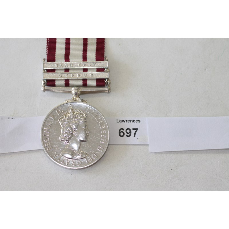A Naval General Service Medal QE11 issue, with bars Cyprus and Near East. Named to C/SS 928206 R W Sowerbutts A.B.R.N.