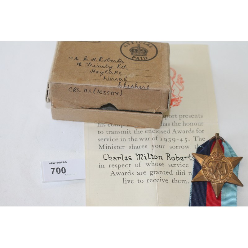 A S S Observer (Liverpool) casualty group of four medals. Box of issue and condolence slip, named to Charles Milton Roberts. 1939/45-Atlantic-Africa-War Medals, all unnamed as issued.