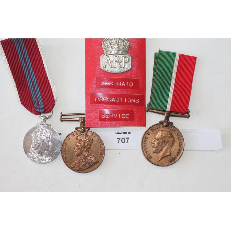 A 1953 Coronation Medal (Mans), A Mercantile Marine Medal named to David Caldwell. A George V Special Constabulary Medal named to William H Burge. Three 1939/45 War Medals. A Defence Medal, ARP badge and whistle.