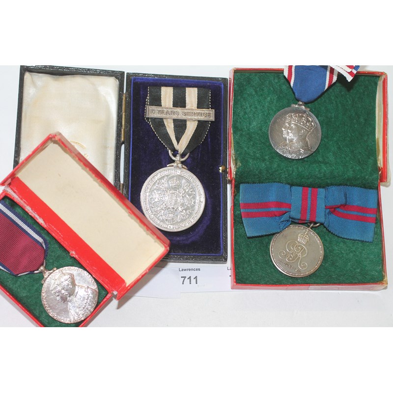 A 1911 Ladies issue, Coronation Medal in partial box. 1935 Jubilee Medal and 1937 Coronation Medals, Mens issues. A Cased Serving Brother of St John of Jerusalem (Silver) issue, named to Dist Treas Surg Capt A J H Montague MD RAMC (T) No 5 Dist 1912. Further 5 Years service bar affixed to the ribbon.(4)