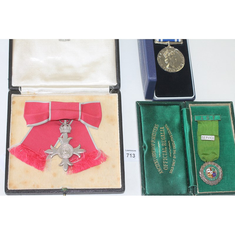 A cased Ladies issue MBE in original Royal Mint Box, on bow ribbon. A cased A O F Masonic silver medal, with Service Bar. Named on th reverse to 1966 Bro G Higgins Court Officer 30 years, Court 6270 SWD. In its original case, with Ancient Order of Foresters, Official Regalia, sold only to the Executive Council inside the lid. A QE11 Police Exemplary Service Medal, named to Const Michael J Brinkworth.