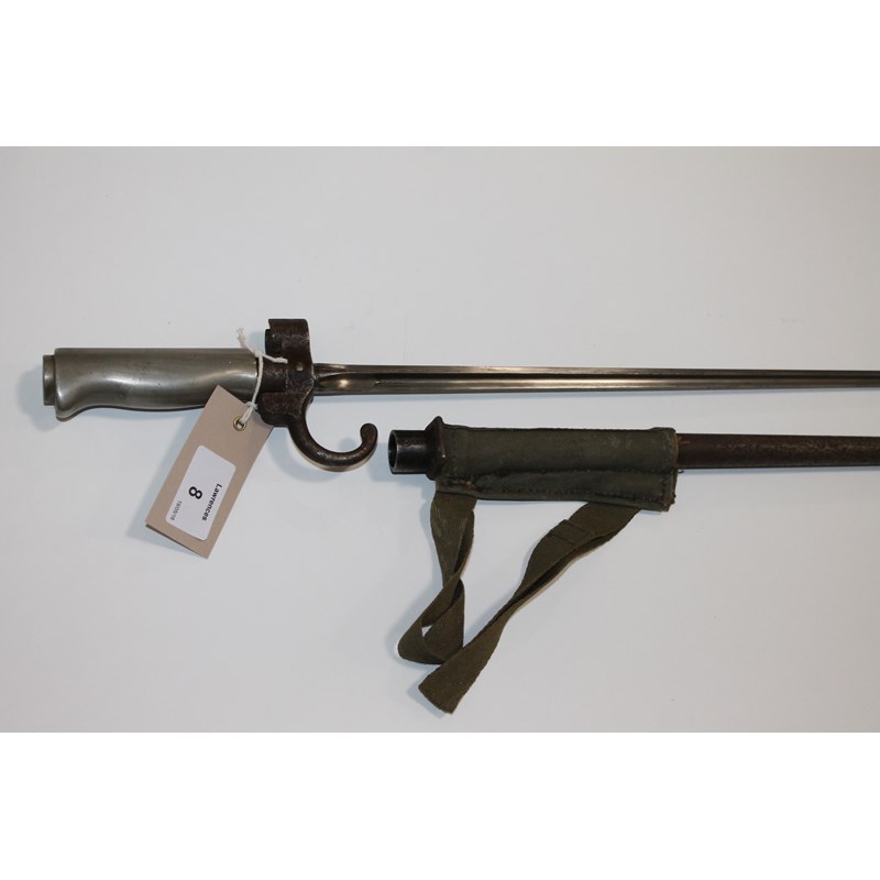A LEBEL BAYONET & SCABBARD. An 1886 model French Lebel bayonet with a very clean 20.1/2" cruciform blade, complete with its metal scabbard.
