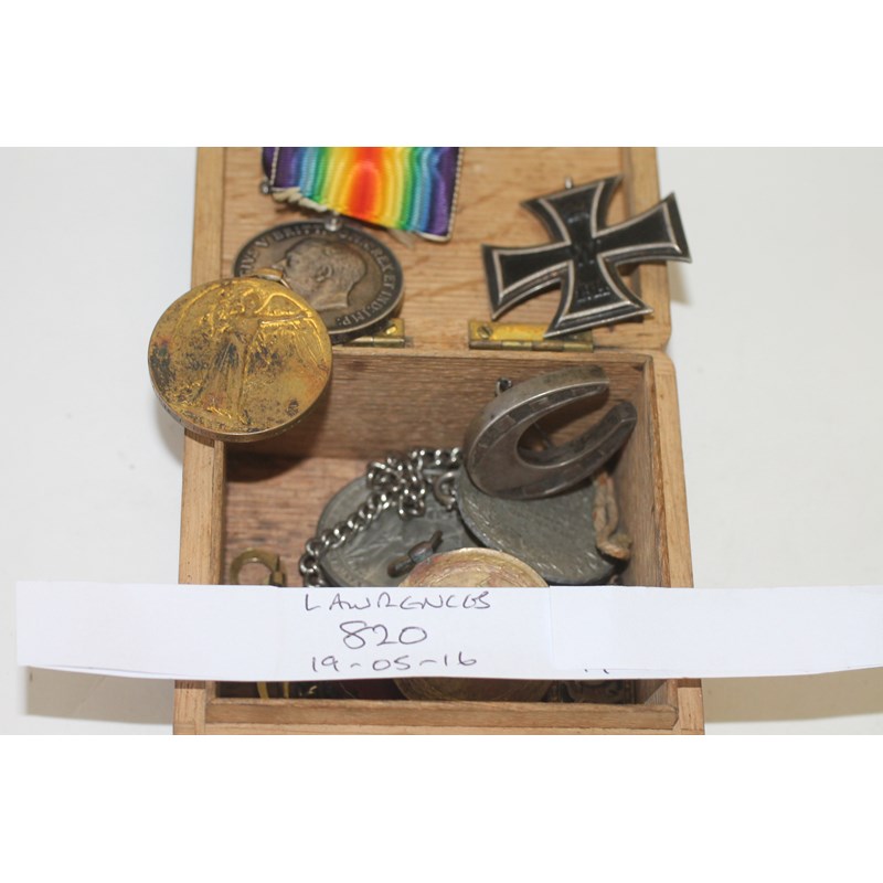 British War & Victory Medals named to 45824 Pte F Burgess MGC. A 2nd Class Iron Cross 1914, lacking its ribbon ring. Also a qty of badges and related articles to Frank Burgess, who is confirmed by the MIC as a pair only.