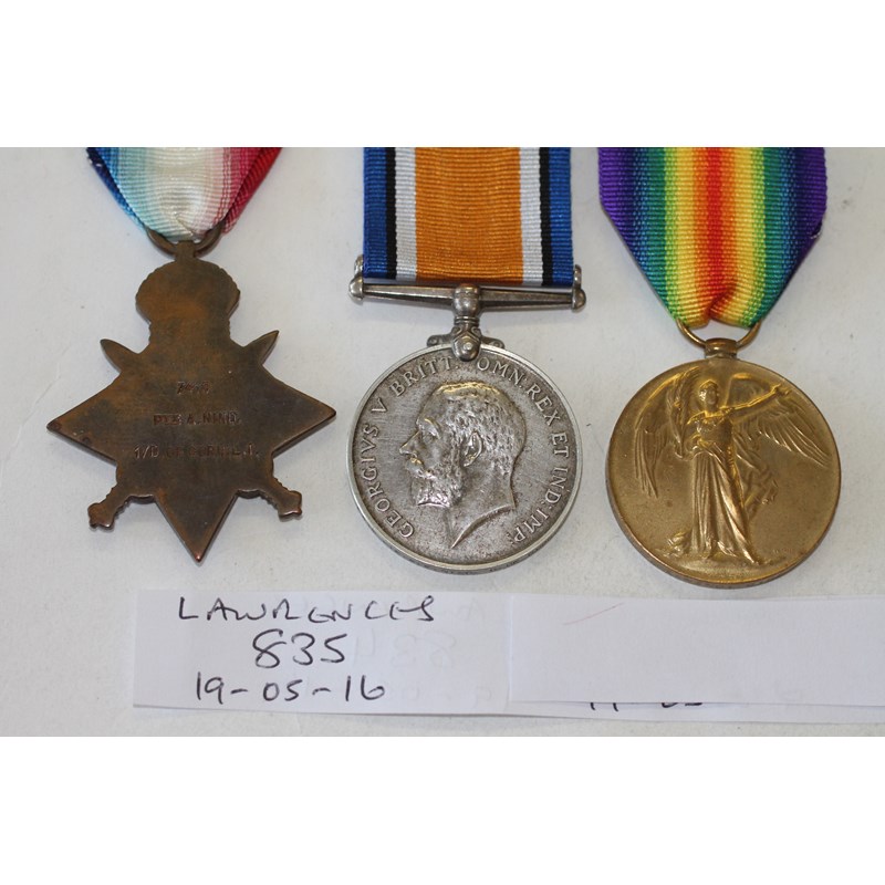 A 1914 Star with bar, named to 7419 Pte A Nind D C L I. British War & Victory Medals named to 7419 Pte A E Nind D. of. Corn. LI.