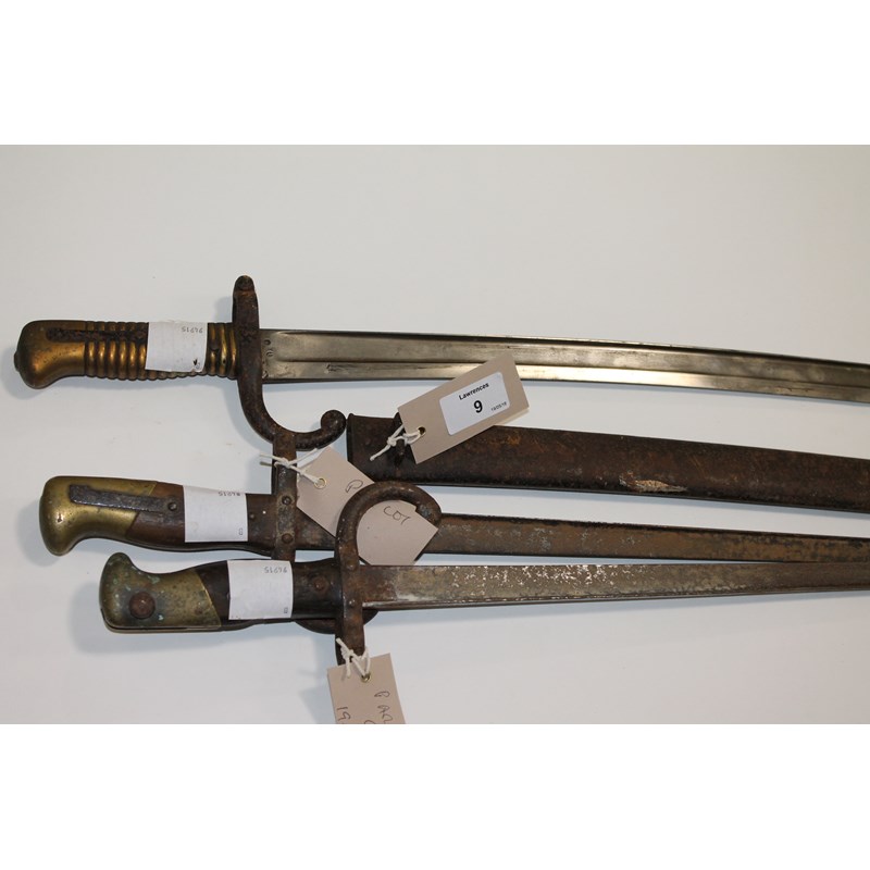 An 1866 Sabre bayonet with brass hilt and clean 22.3/4" yatagan shaped blade, in its metal scabbard. (St Etienne 1870) Two Gras bayonets in poor condition.