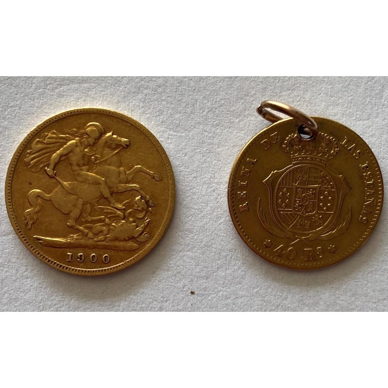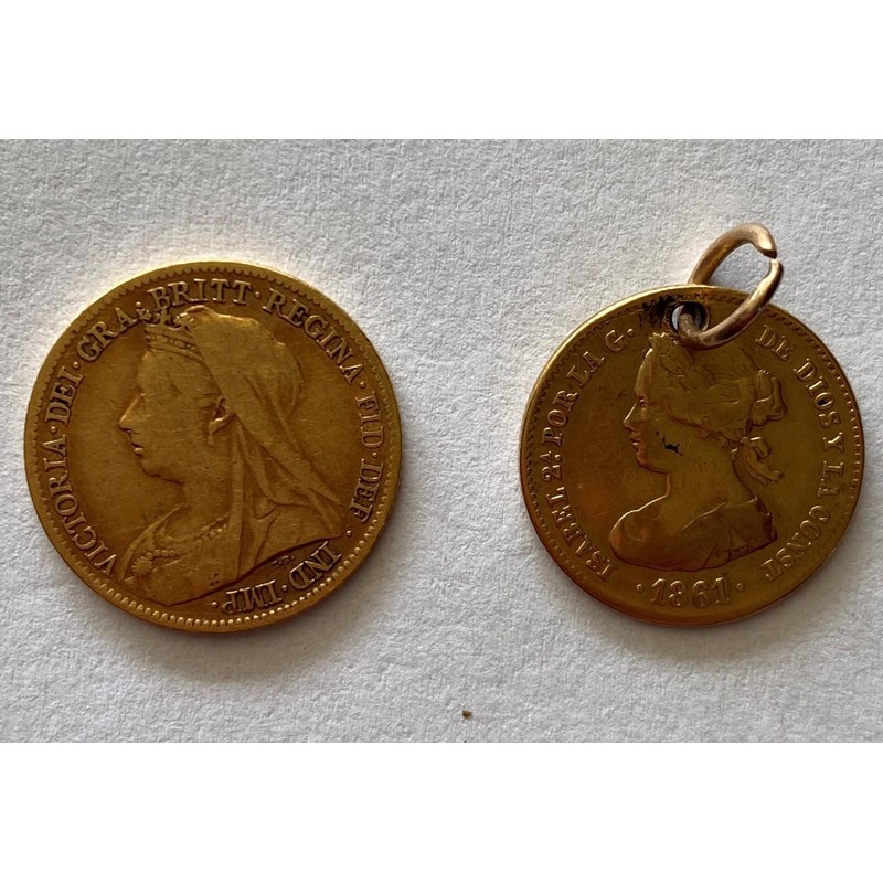 A Victorian Half Sovereign, Old veiled bust l. dated 1900, with a Spanish 40 Rs Gold coin dated 1861, pierced for suspension. (2) c.7.38g total.