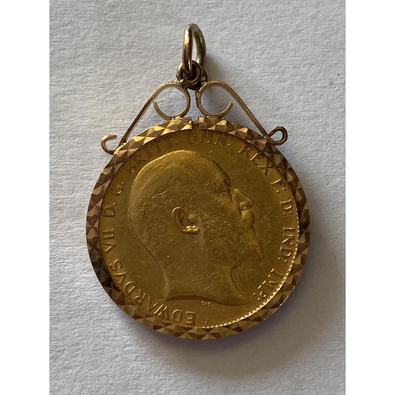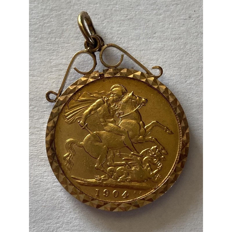AN EDWARD VII GOLD SOVEREIGN, 1904, IN MOUNT. An Edward VII Gold Sovereign dated 1904 in a decorative 9ct Gold mount, c9.24g in total.