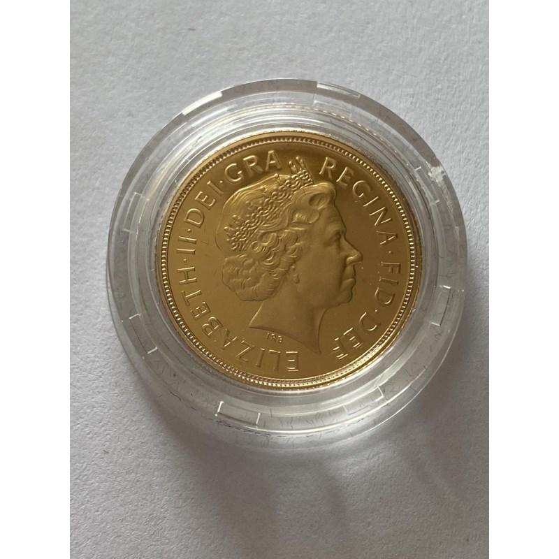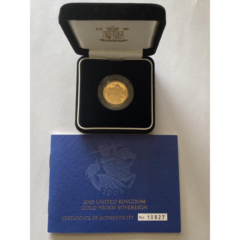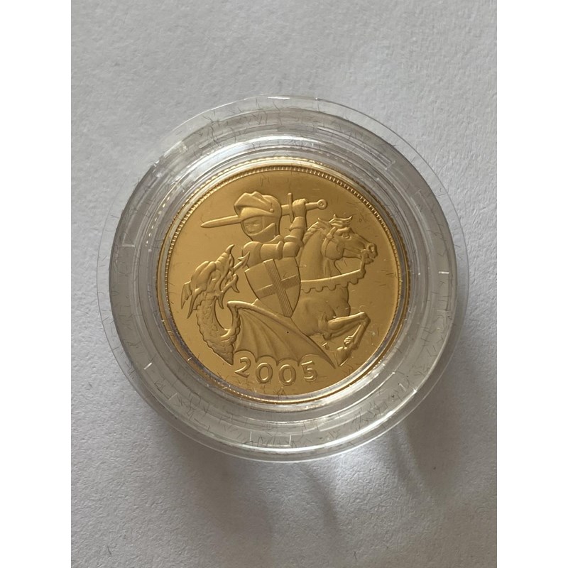 A QUEEN ELIZABETH II PROOF SOVEREIGN. A Queen Elizabeth II Proof sovereign dated 2005, with St George and Dragon reverse by Timothy Noad, encapsulated and in Royal Mint presentation packaging, from an edition of 17,500.