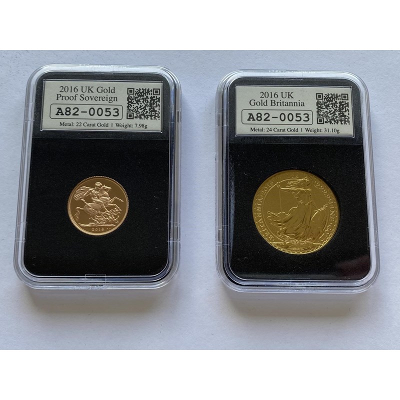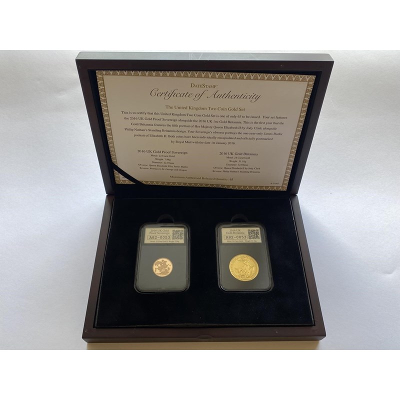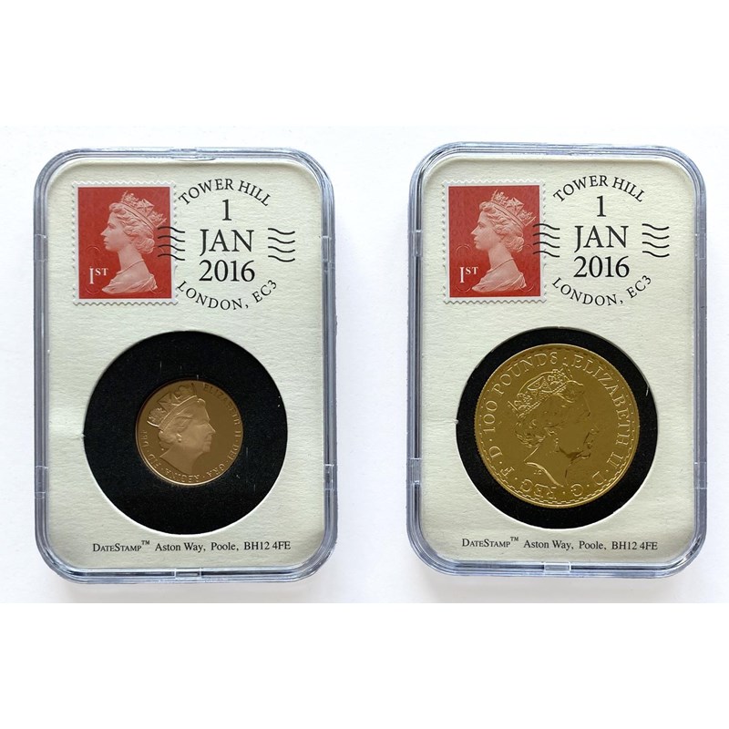 An Elizabeth II two coin set comprising a proof sovereign dated 2016, the obverse with the portrait by James Butler, slabbed and 'date stamped' with a first class stamp and postmark for 1 Jan 2016. 7.98g. And a 2016 Gold Britannia, similarly slabbed and postmarked. 31.10g. In presentation case and insert suggesting an edition size of 63 sets.