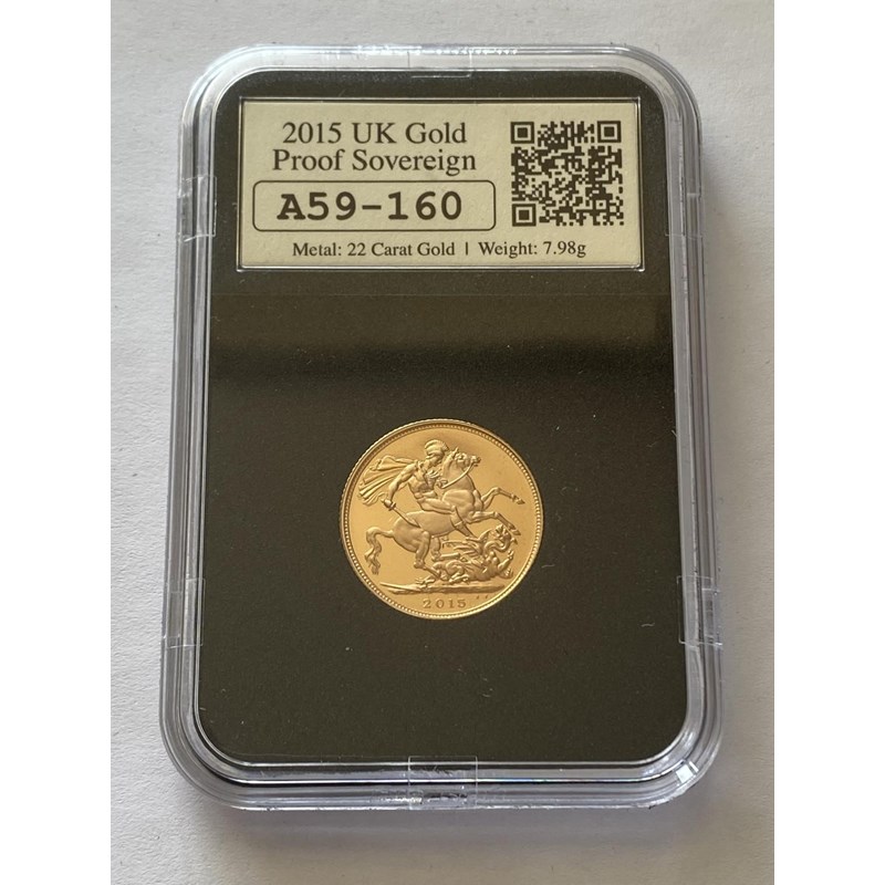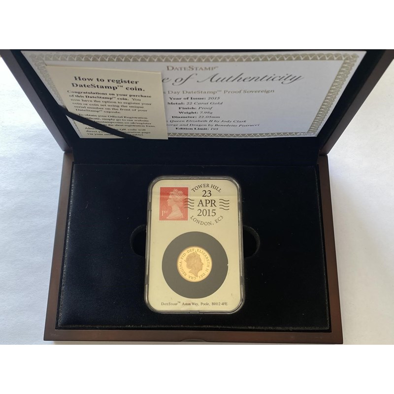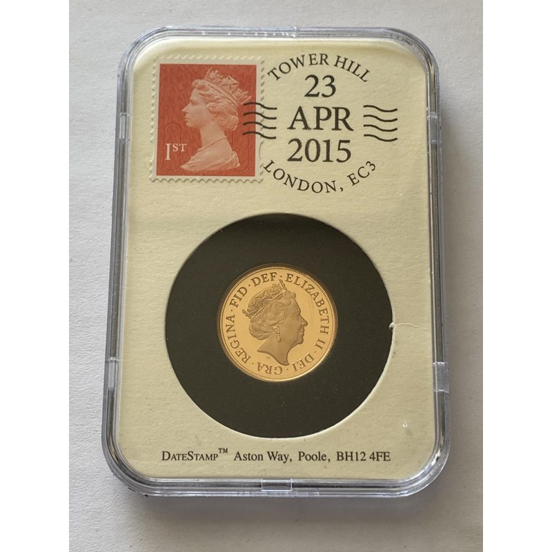 A Queen Elizabeth II Proof sovereign dated 2015, slabbed and 'date' stamped with a first class stamp and postmark of 23 Apr 2015, St George's Day, from an edition of 195 with this presentation packaging. 7.98g.