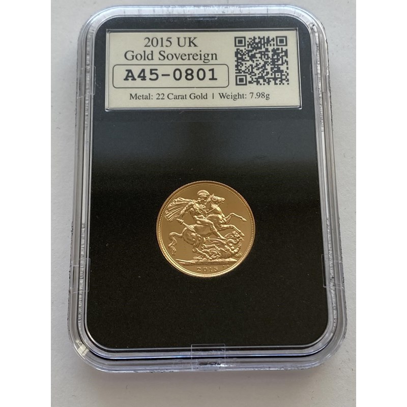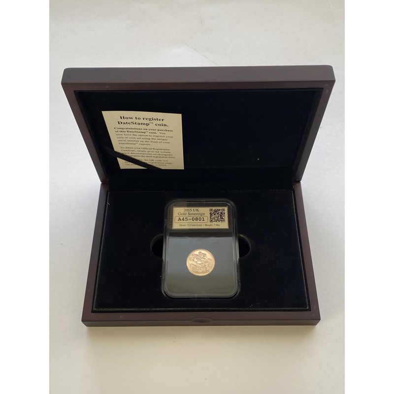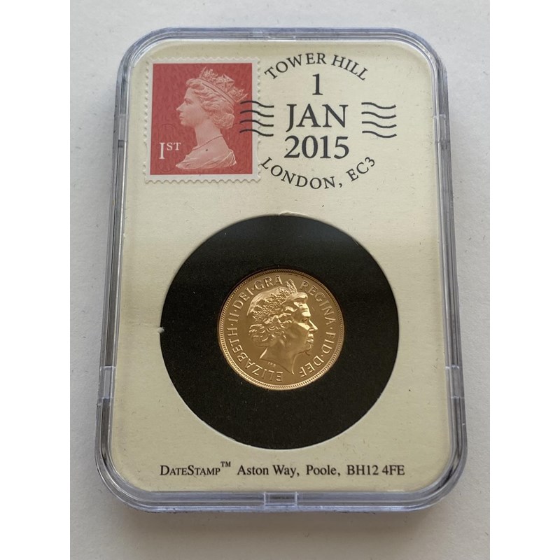 AN ELIZABETH II PROOF SOVEREIGN. An Elizabeth II proof sovereign dated 2015, slabbed and 'date stamped' with a first class stamp and franking dated 1st January 2015. In presentation case, 7.98g.