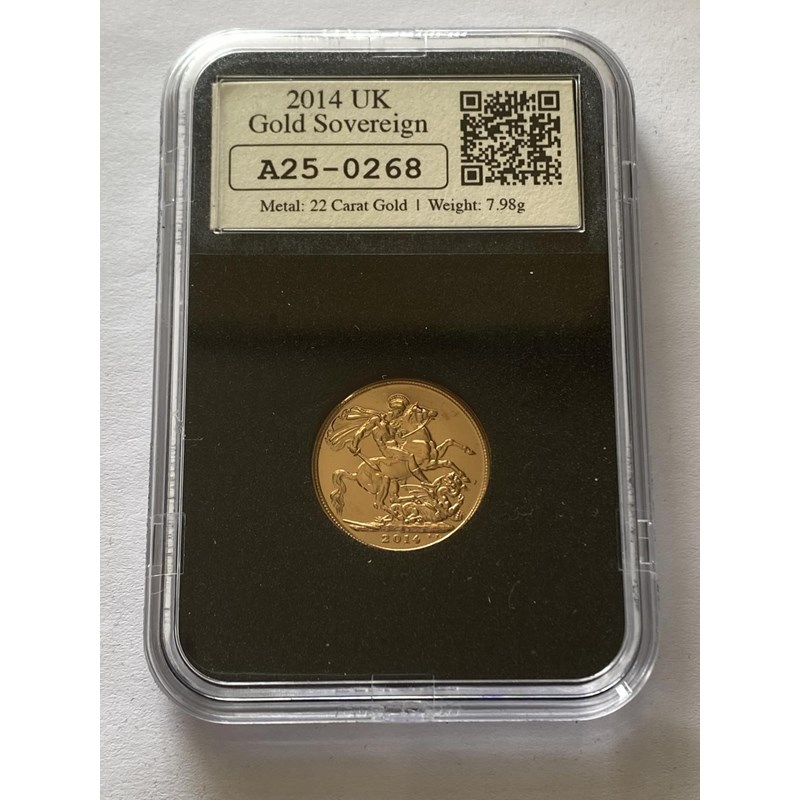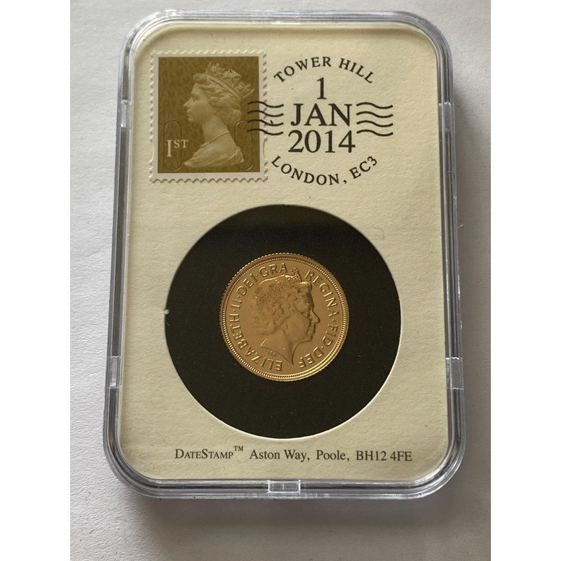 A QUEEN ELIZABETH II PROOF SOVEREIGN. A Queen Elizabeth proof sovereign dated 2014, slabbed and 'date stamped' with a first class stamp and post mark for the 1st of January 2014, in presentation case, 7.98g.