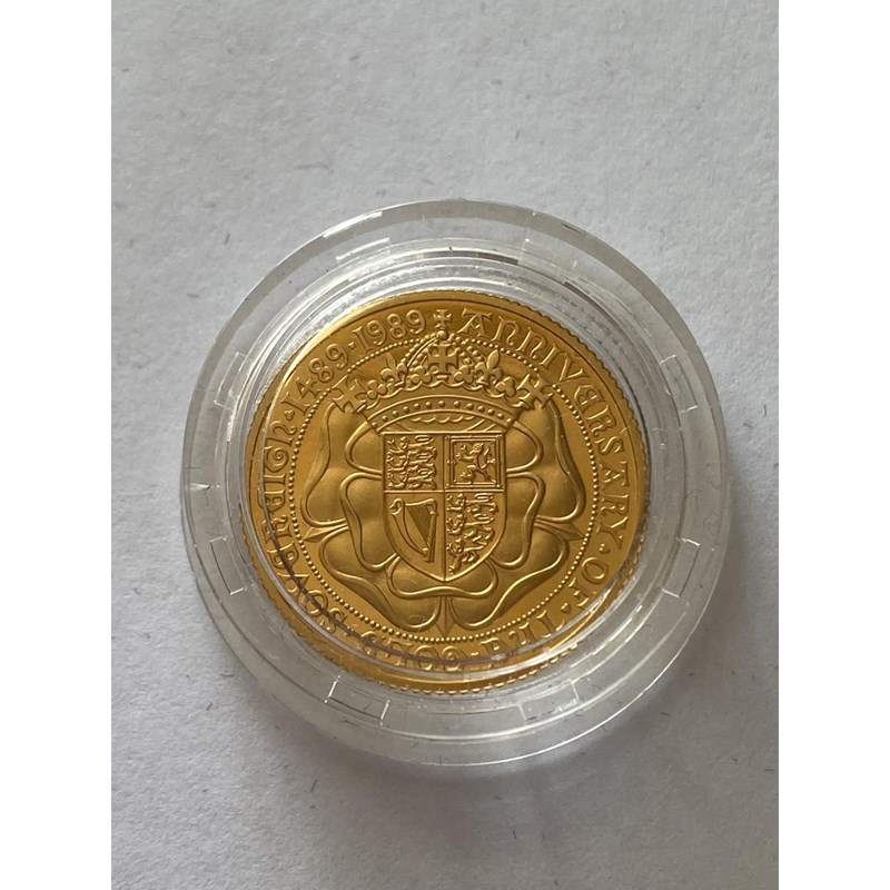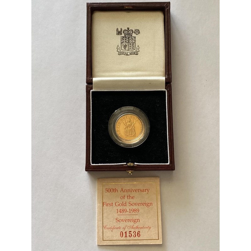 An Elizabeth II Proof gold sovereign dated 1989, 500th Anniversary of the First Gold Sovereign 1489-1989 edition, encapsulated and in Royal Mint presentation packaging with insert numbered 01536 and a suggested edition size of 12,500, 7.98g.