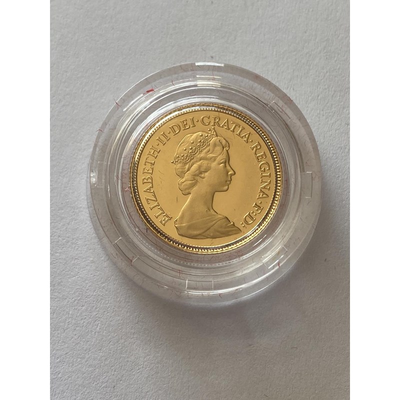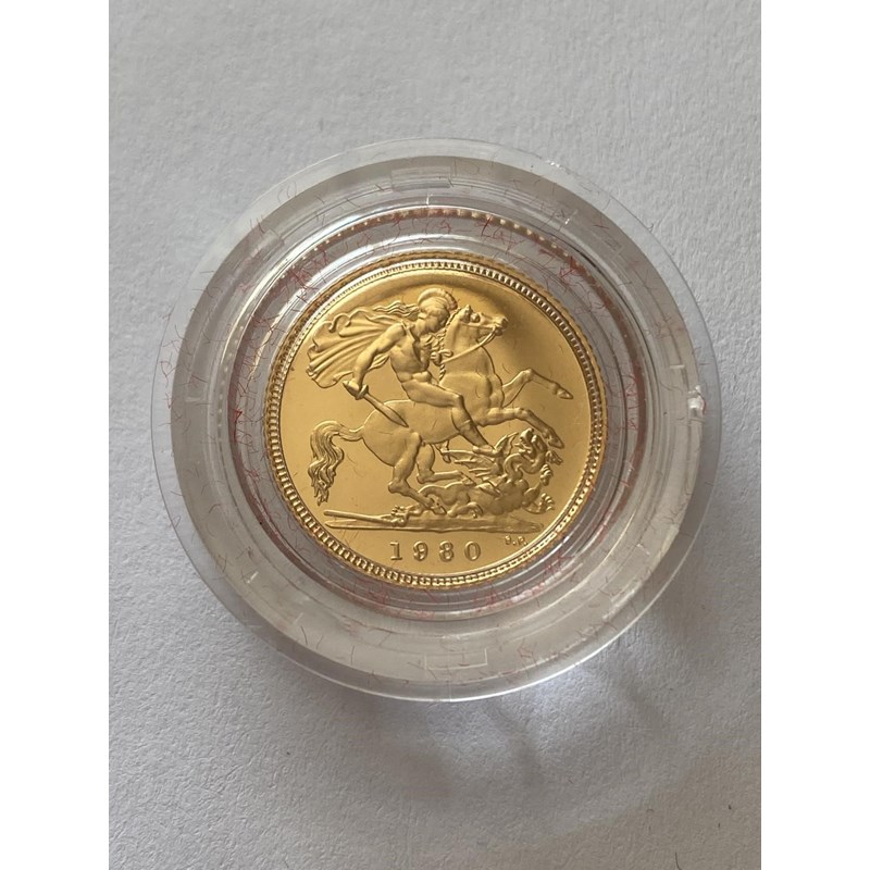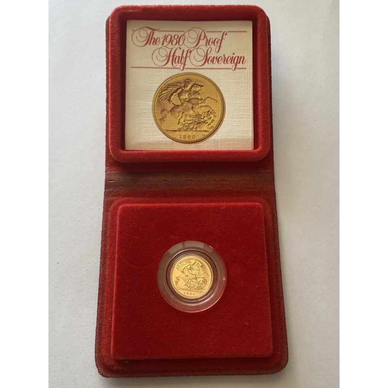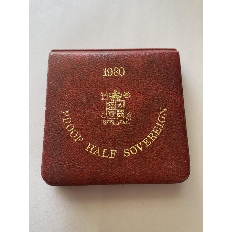 AN ELIZABETH II PROOF HALF SOVEREIGN. An Elizabeth II proof half sovereign dated 1980, encapsulated and in presentation case with insert. 3.99g.