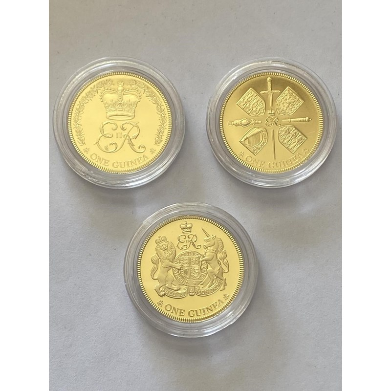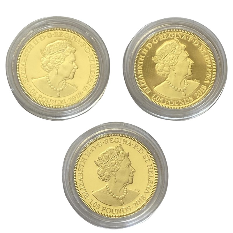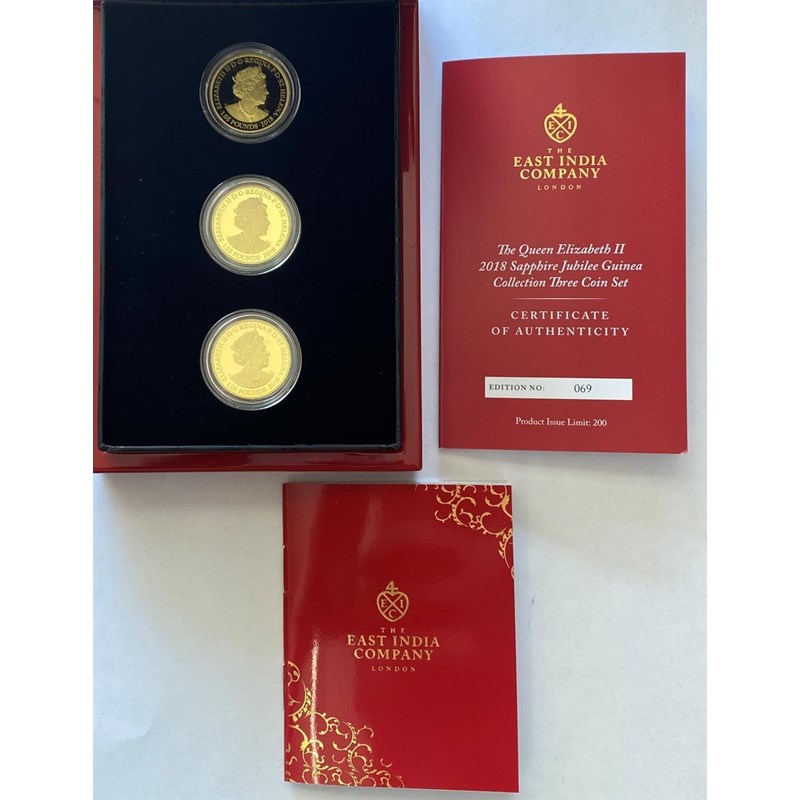 An Elizabeth II three coin set from St Helena, each encapsulated, comprising 2018 Royal Arms Guinea Gold proof coin, 8.4g from an edition of 1,265, a 2018 Royal Cypher Guinea Gold proof coin, 8.4g from an edition of 1,265 and a 2018 Coronation Guinea gold proof coin, 8.4g from an edition of 1,265. In East India Company branded presentation packaging and insert numbered 69 from an edition of 200.