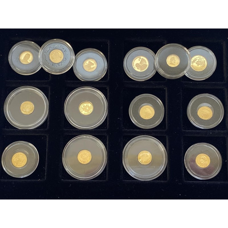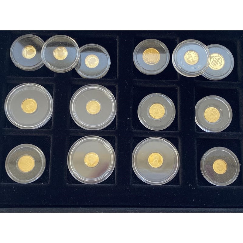 A collection of fourteen small gold coins to include 'Gorch Fock' proof coin from the Cook Islands, 0.5g, 'St George and the Dragon' proof coin from the Cook islands, 0.5g and others, each encapsulated and contained in a Westminster Mint presentation case with descriptions for each coin. Approximately 6.5g.