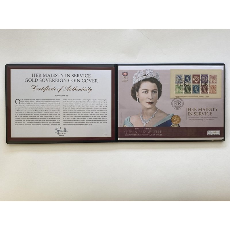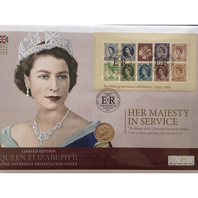 An Elizabeth II 2015 gold Sovereign mounted on a presentation cover with the Royal Mail 2003 Wilding II Definitives Miniature sheet postmarked 1st January 2015, the cover numbered 39 from an edition of 95. In Westminster Mint packaging. 7.98g.