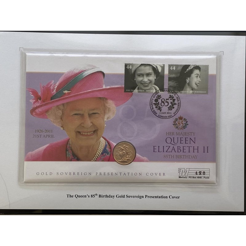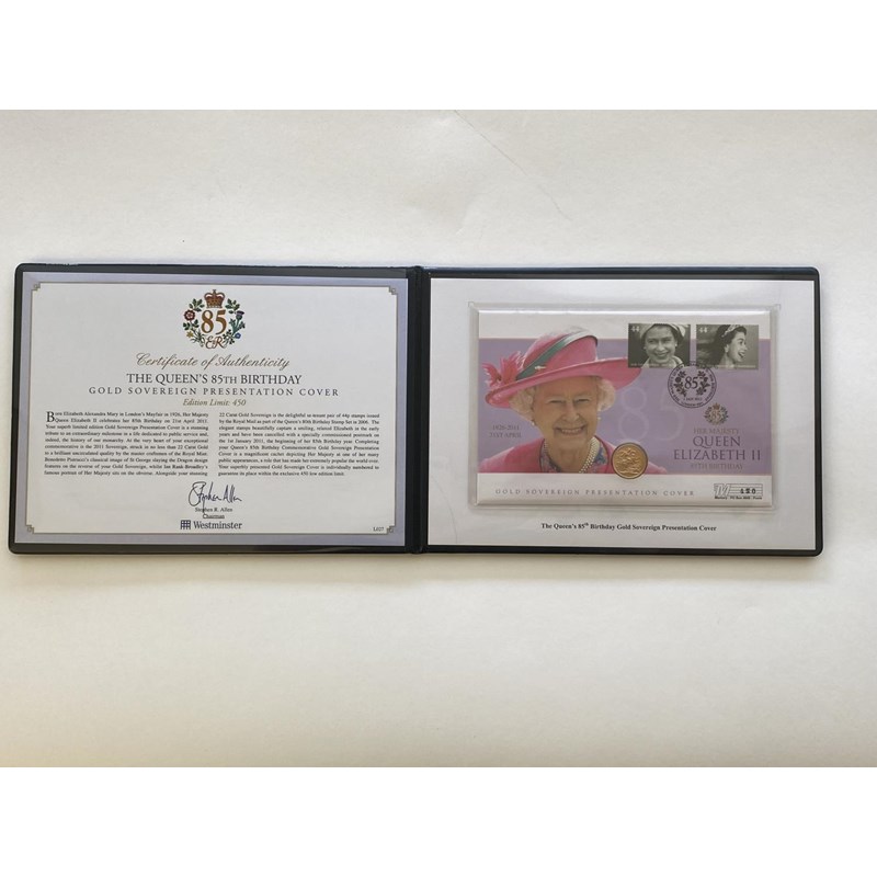 An Elizabeth II 2011 'Queen's 85th Birthday presentation cover' with a 2011 gold Sovereign mounted on a presentation cover with the Two Royal Mail stamps postmarked 1st January 2011, the cover numbered 450 from an edition of 450. In Westminster Mint packaging. 7.98g.
