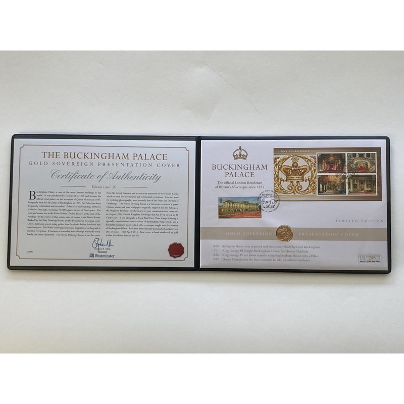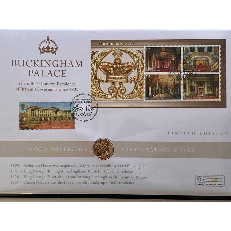 An Elizabeth II 2014 gold Sovereign mounted on a presentation 'Buckingham Palace' cover with the Royal Mail stamp of Buckingham Palace and miniature sheet, all postmarked for 15th April 2014, the cover numbered 38 from an edition of 50. In Westminster Mint packaging. 7.98g.
