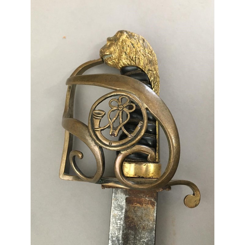 With a broad 75cm curved single sided blade with shallow fuller, with gilt engraving against a blued background of a crown above conjoined initials and a standing figure of a Light Company Officer wearing a Tarlton pattern helmet, Royal coat of arms, crossed baton and sword and other motiffs, the guard of double S bar type with a central slung bugle in a circle, with a wire wound ebony grip and gilt lions head pommel, in a leather scabbard with three mounts with scrolling details, 93cm overall.