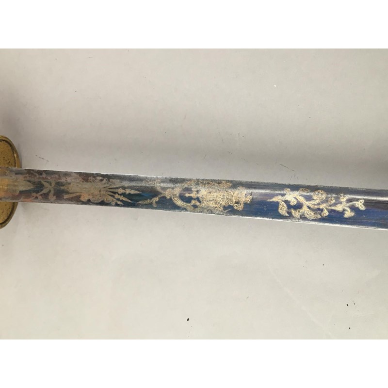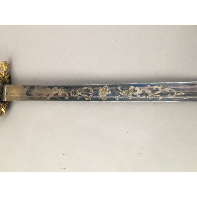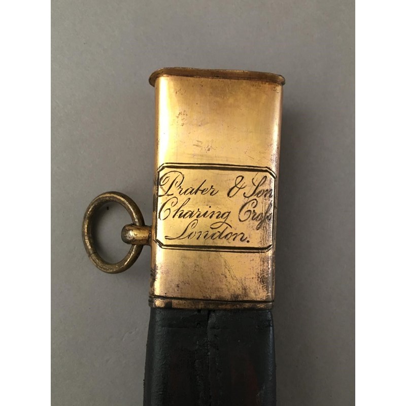 With an 82cm tapering pointed and gently fullered blade, with gilt and blued section decorated with a crown above GR and a standing figure of an Infantry officer in bicorn hat with sword drawn, a post 1801 Royal coat of arms and a military trophy, the remainder of the blade finely etched with scrolling foliage and military trophies, the double shell guard with hinged side, wire wound grip and vase shaped pommel, with a leather scabbard with three gilt mounts with double ring suspension. The top mount engraved 'Prater & Son Charring Cross, London'. 103cm overall.