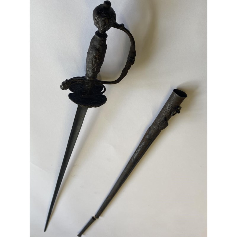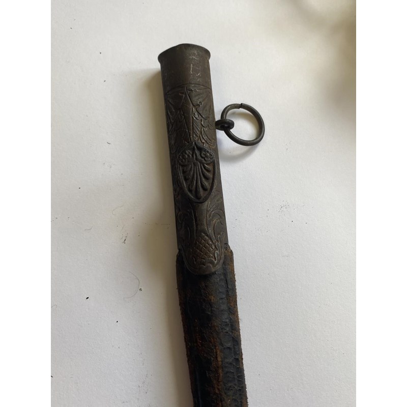 With an 81cm triform blade with engraved scrolling decoration and initials 'IGB' to the ricasso, with a cast guard and grip with all over renaissance style decoration, in a similarly decorated distressed leather and steel scabbard.