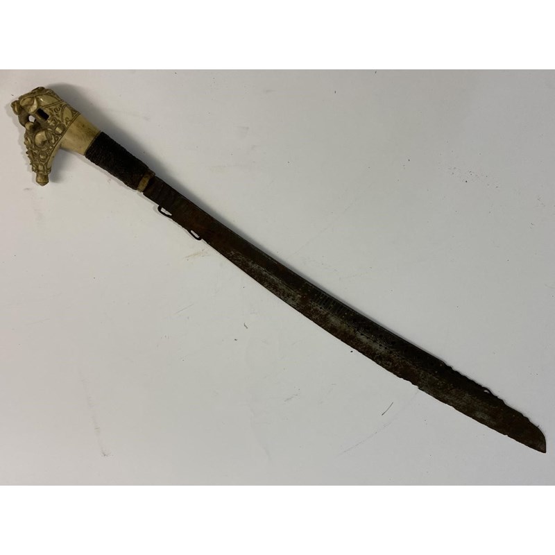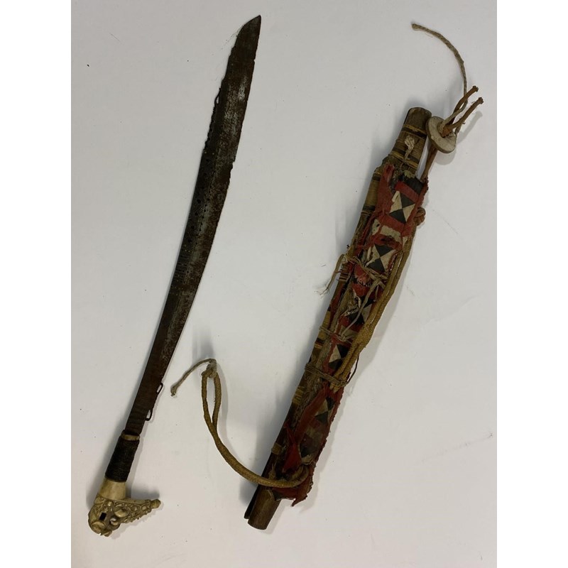 A Dyack type 'Head Hunters' sword and scabbard with profusely carved bone handle and 53cm curved blade with engraved and pierced back with 'gilt' dot decoration. The carved hardwood scabbard with raffia binding and decoration, decorative fabric backing and cord with ceramic disc.