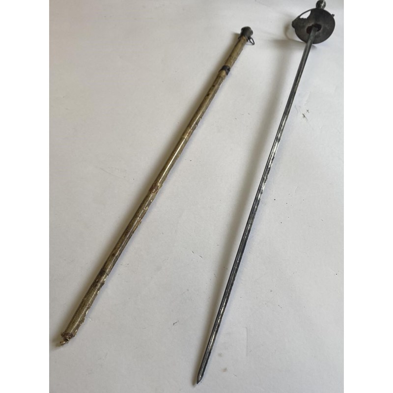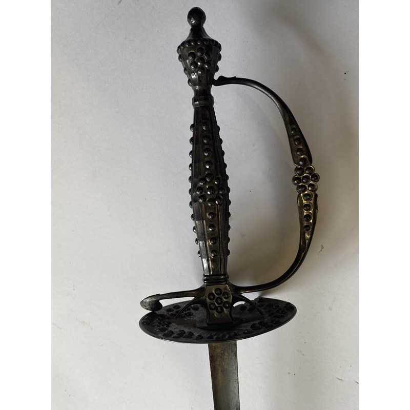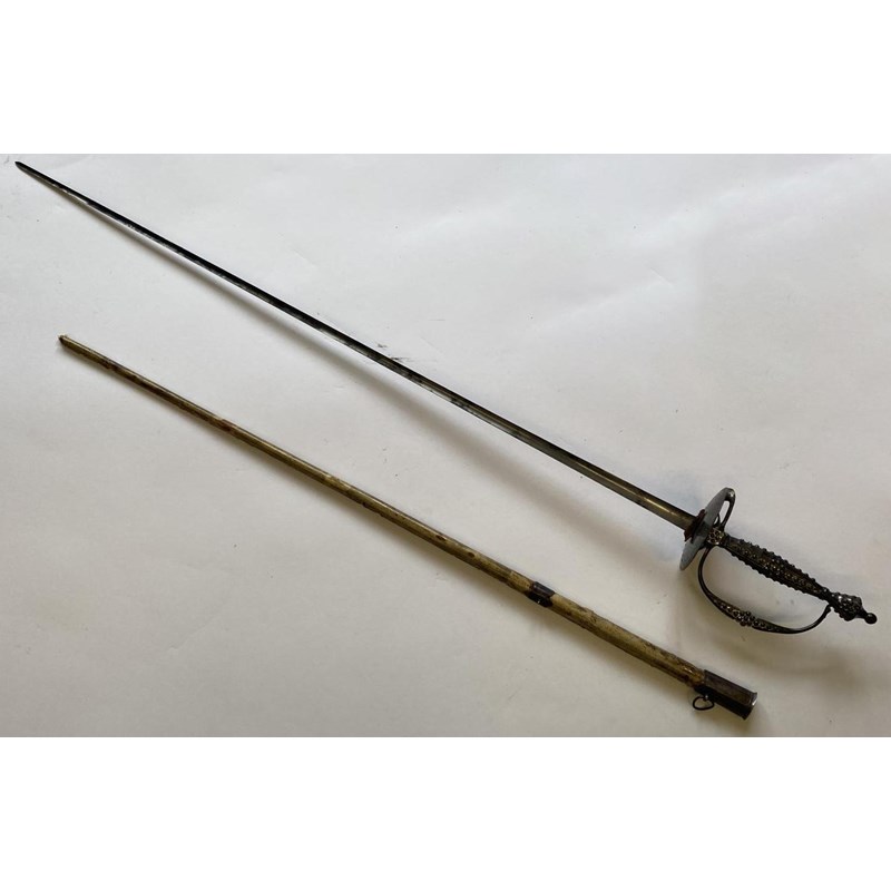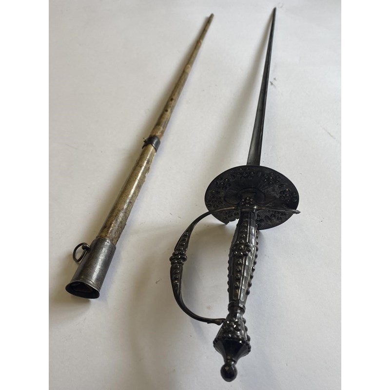 With a 77cm triform tapering pointed blade, with a circular dished guard and polished cut steel grip, bow and vase shaped pommel, in a steel mounted scabbard with shagreen effect covering. 95cm overall length.
