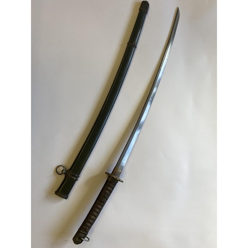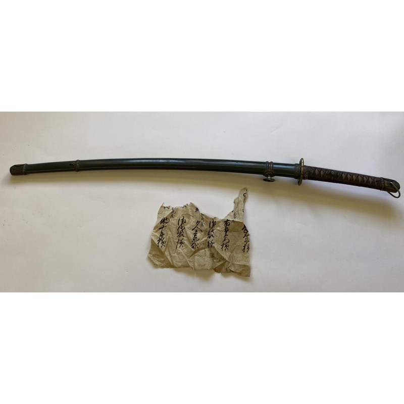 A Japanese sword (Shingunto) with a 68cm single sided blade with sharpened edge and signature to the tang, with brass Tsuba stamped '30' with pairs of white metal mounts to either side, the shagreen grip bound with fabric and foliate brass mounts, with green finished steel scabbard with single ring suspension, 98cm overall, With a fragment of page of Japanese text.