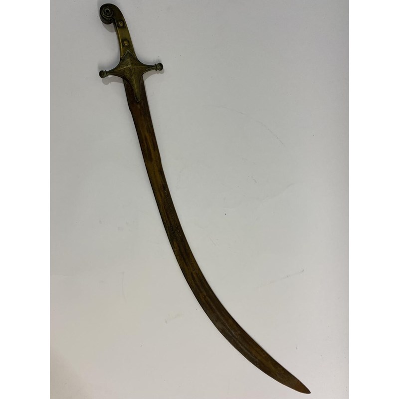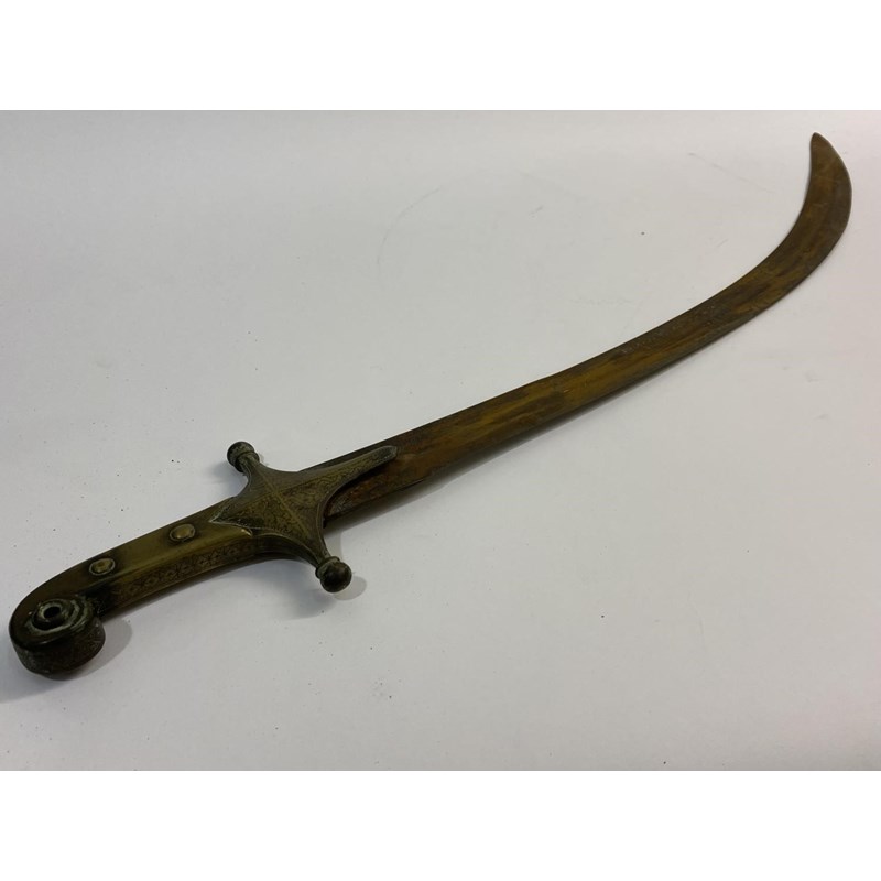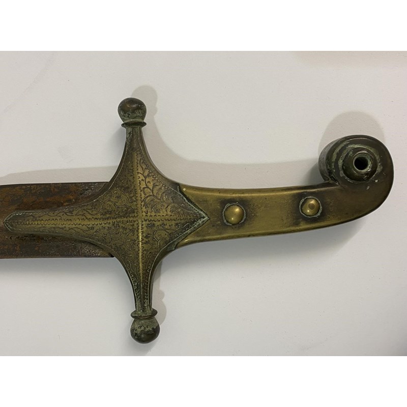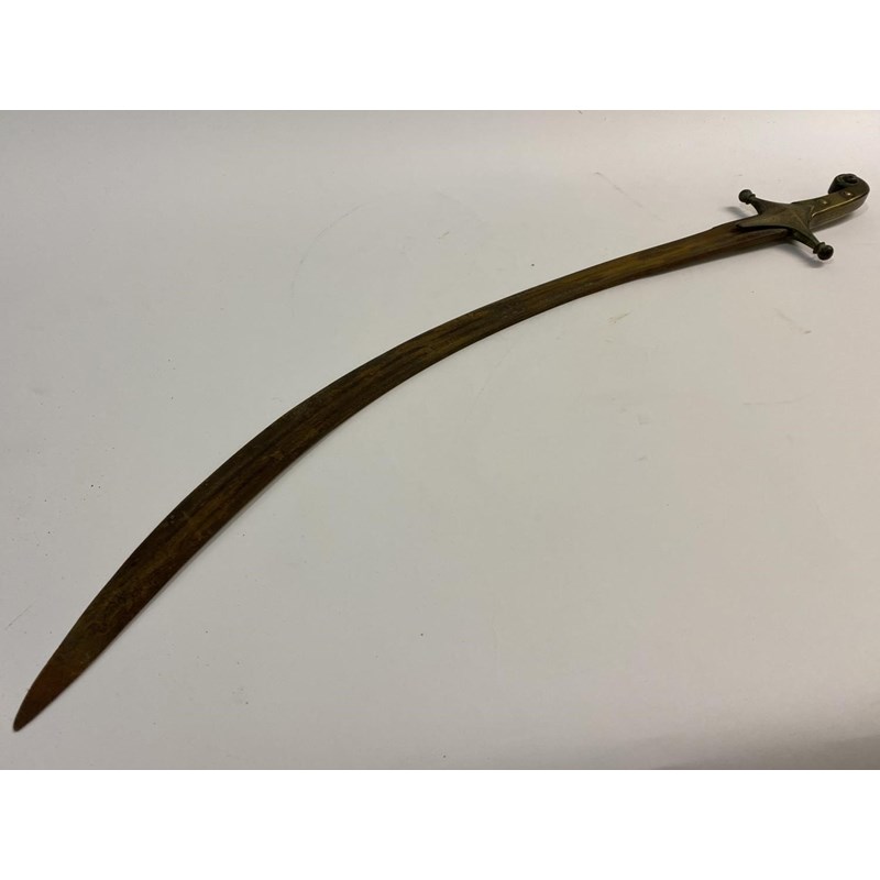 AN INDIAN MAMELUKE TYPE SWORD. A Mameluke style sword with a 73cm curved, double fullered blade with sharpened edge, the brass handle with engraved scrolling decoration and extended langets, 86cm overall. No scabbard.