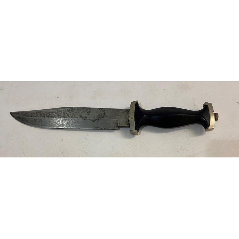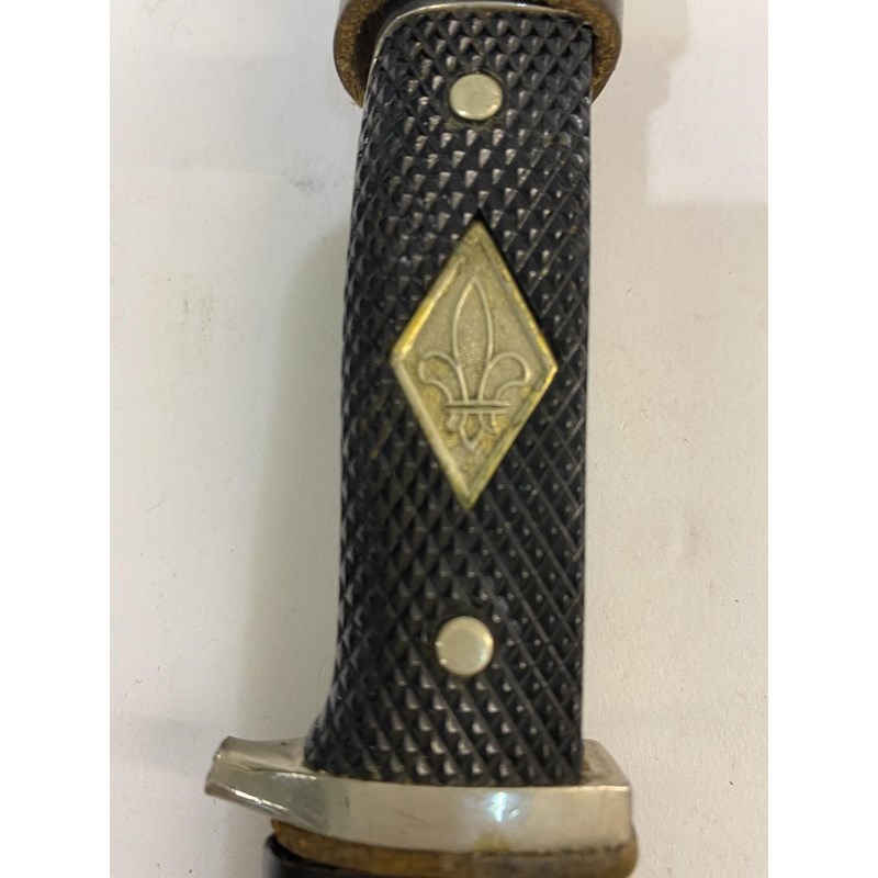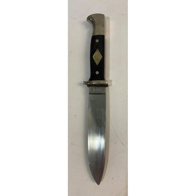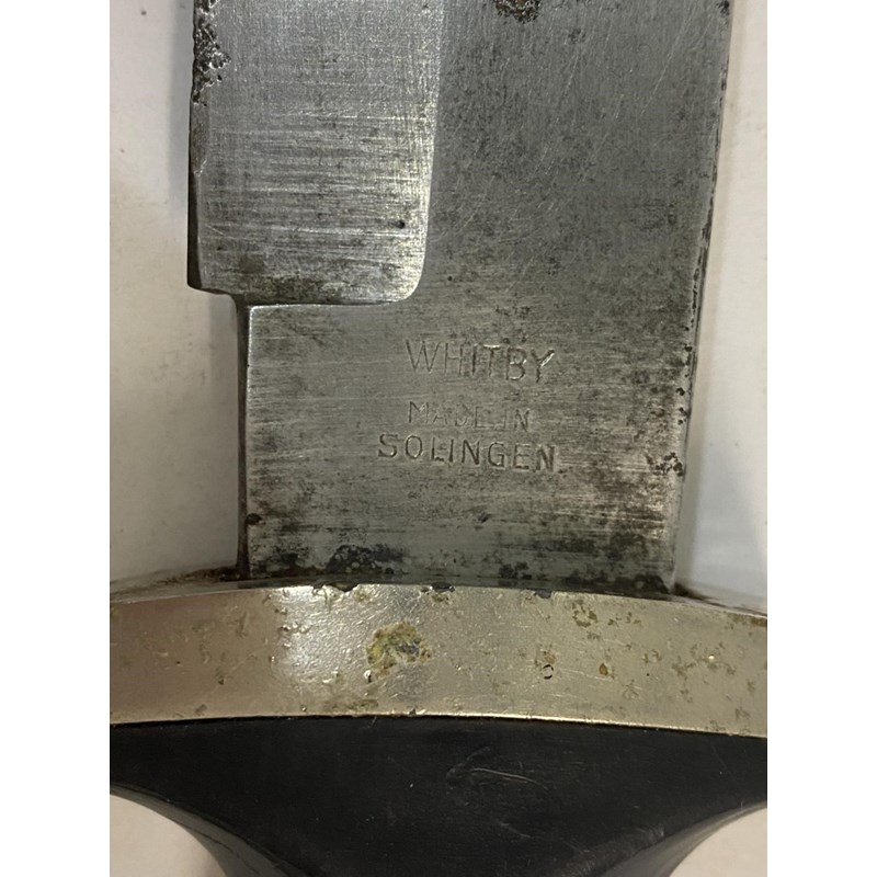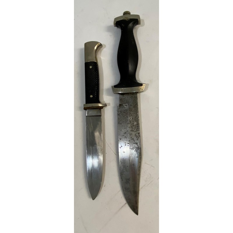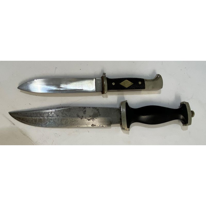 A German fighting knife or dagger with an 18cm blade with sharpened edge and marked to the ricasso 'Whitby Made in Solingen' with Second World War SS style handle with composition black grip and plated mounts, 30.5cm overall. And a Hitler Youth/Scout knife with a 14cm blade with sharpened edge, the blade marked 'Anton Wingen Jr Solingen Germany' and to the other side 'Othello Solingen Rostfrei' beneath a head, on a two part checkered grip with inset scout symbol and matching scabbard, (2)