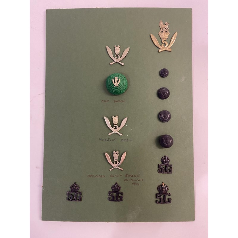 A small collection of 5th Royal Gurkha Rifles (Frontier Force) insignia to include four buttons, cap badges and silver officers beret badge hallmarked for 1944. 13 items mounted together.