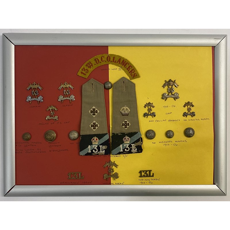 A collection of 13th Duke of Connaught's Own Lancers insignia including a shoulder title in red and yellow, cap and collar badges and a pair of shirt or jumper shoulder titles. 19 items mounted on a framed board.