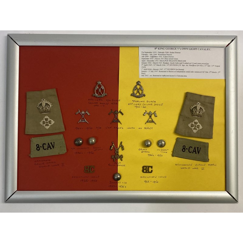 A collection of 8th King George V's Own Light Cavalry insignia including silver officers collar badges, one hallmarked for 1938, buttons, shoulder titled and others. 17 items mounted on a framed board.