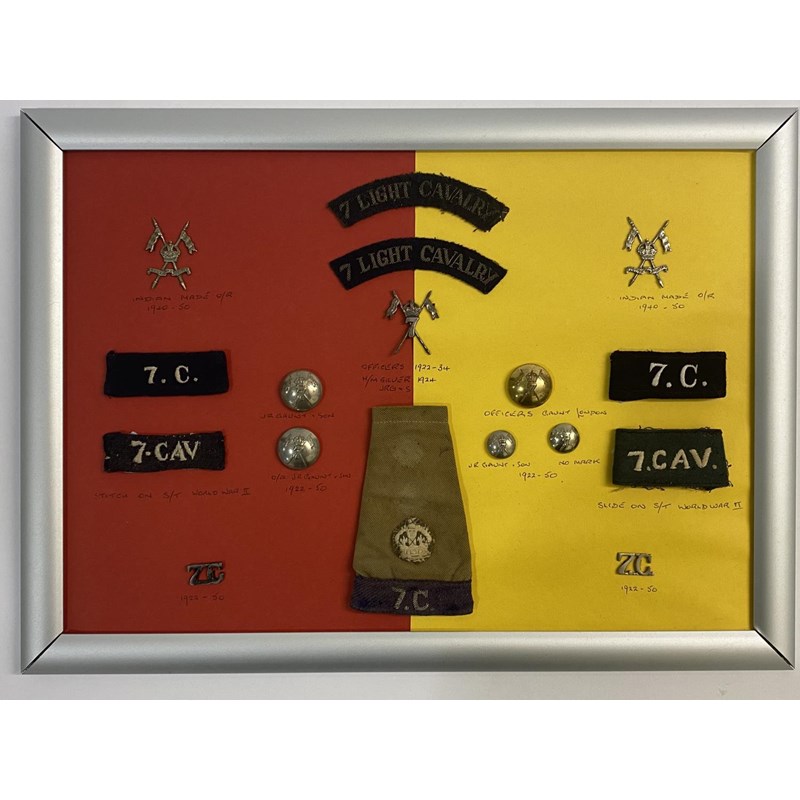 A collection of 7th Light Cavalry insignia including fabric shoulder titles, an officers silver badge with '7' beneath a crown and with crossed lances behind, hallmarked for 1924, five buttons and other items. 17 items mounted on a framed board.