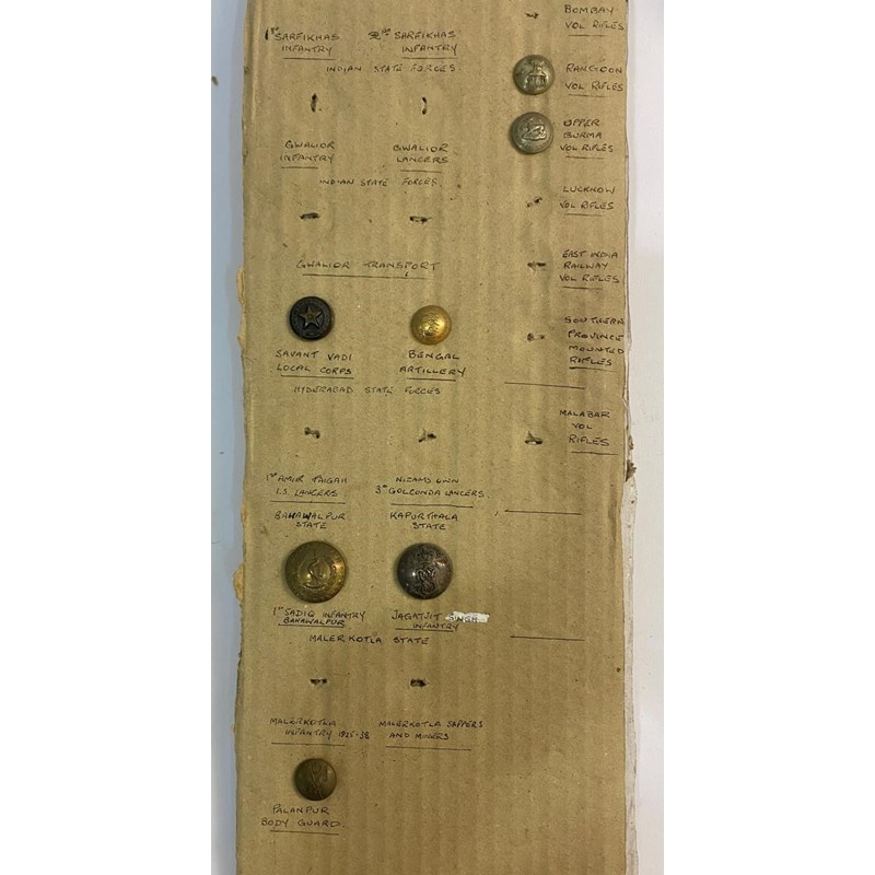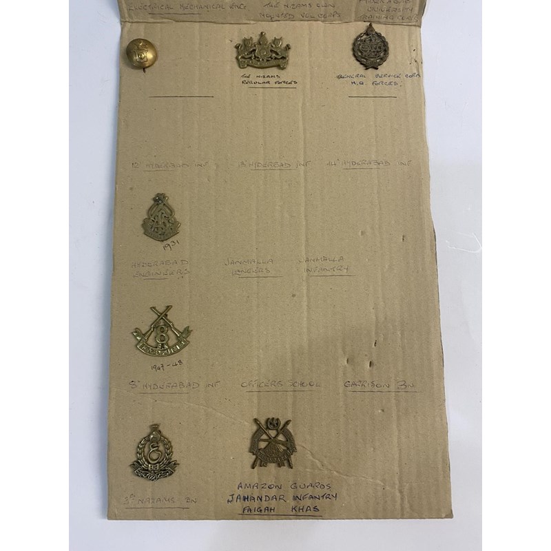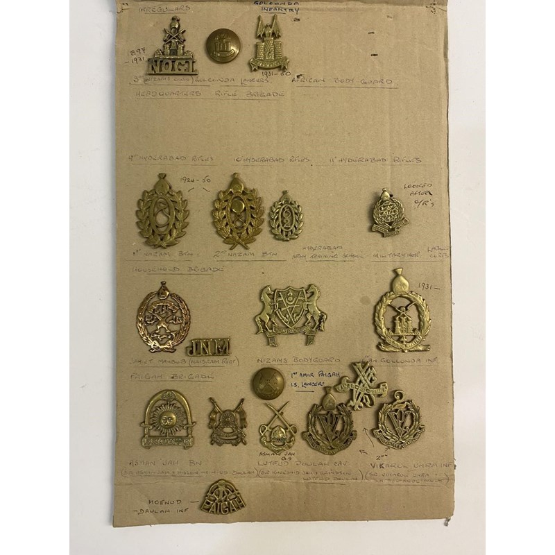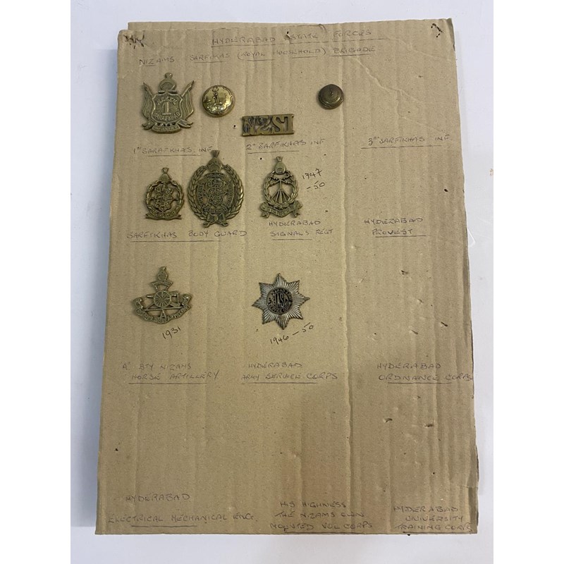 A large collection of Hyderabad state forces badges and buttons to include examples for the regular forces, general service corps, engineers, Body guard, military hospital, 7th Infantry and many others. 63 items mounted on three boards.