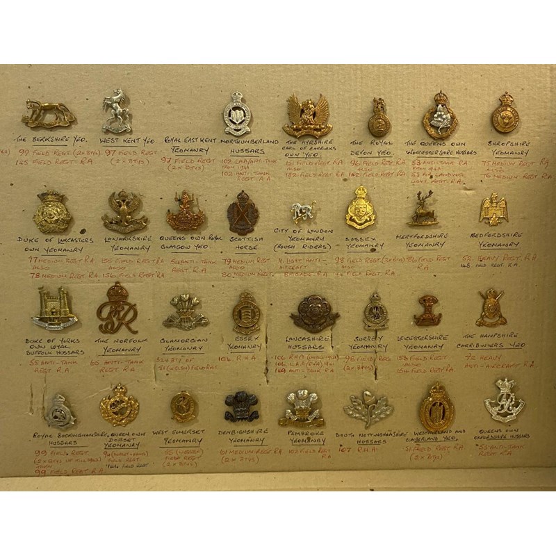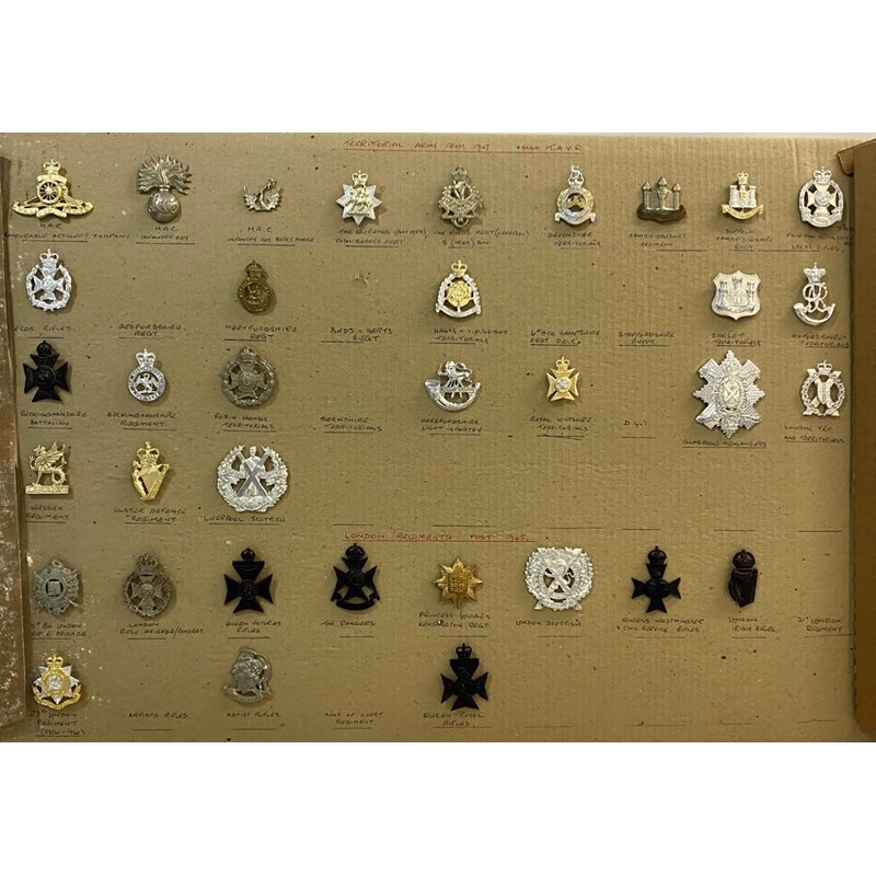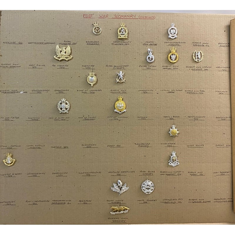 A collection of British Military Cap badges to include badges for the Territorial Army from 1947, London Regiments Post 1945, seventeen post war staybright Yeomanry badges, and a further 31 Yeomanry, Hussars and similar badges. 83 badges mounted on three boards.