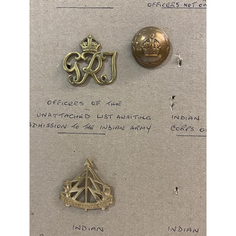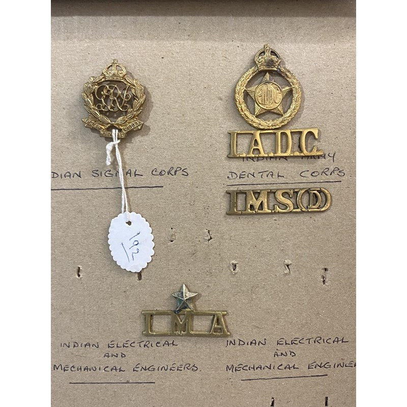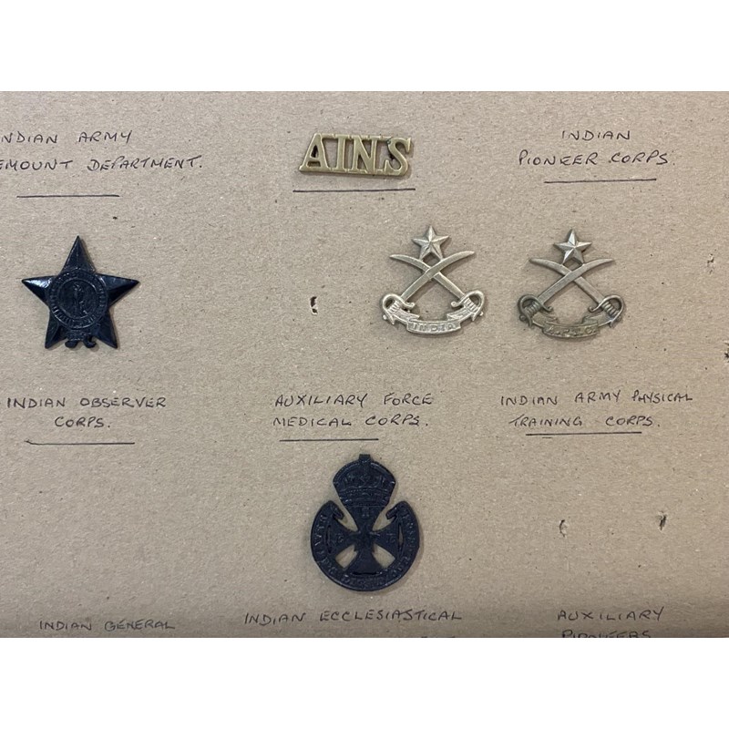 A selection of badges and buttons to include various Gurkha Rifles badges, Physical training corps, observer corps, Govenor Generals bodyguard, Chamar regiment and others. 65 items mounted on four boards.