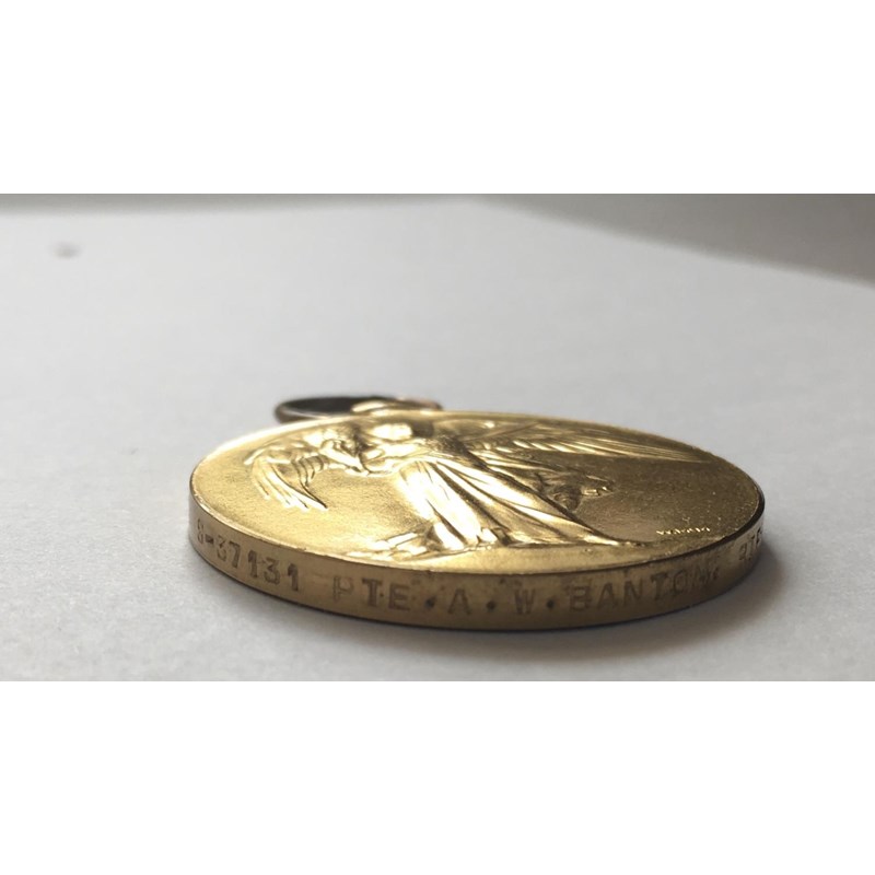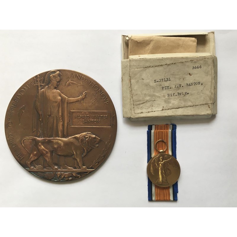 A Great War Victory Medal named to S-37131 Pte A.W. Banton Rif Brig. With war medal ribbon and box of issue. With memorial plaque to Alfred Walter Banton. Born c. 1879, son of Herbert and Jane Banton of Lichfield Staffs, and husband to Emily M, Banton at 238 Park Road in Birmingham. He served with the London Regiment (Post Office Rifles), killed in action on the 25th July 1918 he is buried on the Somme at Dernacourt Communal Cemetery Extension, in a line of mostly unknown graves, his headstone reads 'In the Midst of Life we are in death'.