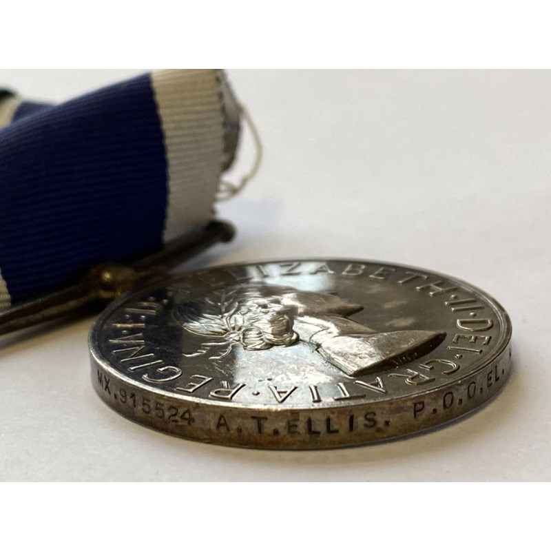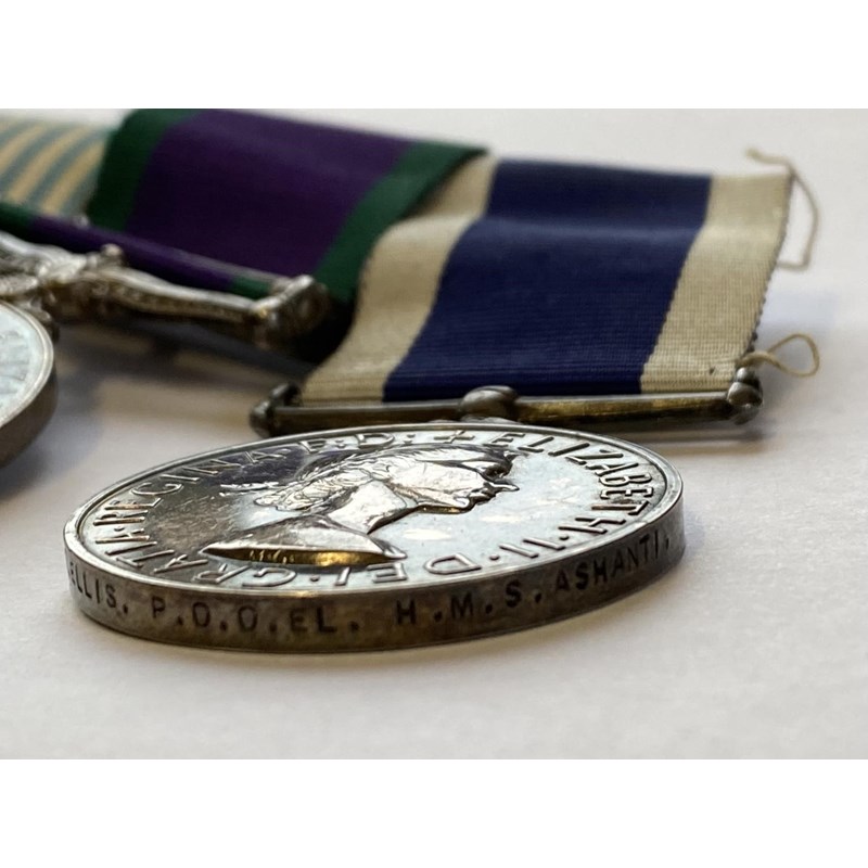A group of four comprising a Naval General Service Medal 1909-62 with Near East clasp named to P/MX915524 A.T.Ellis L.E.M. R.N., United Nations Korea Medal, General Service 1962-2007 with South Arabia clasp named to M915524 A.T.Ellis O.E.L (Local) R.N. and Long Service and Good Conduct Medal to MX915524 A.T. Ellis A/C P.O.O.EL H.M.S. Ashanti. Leading Electrical Mechanic Ellis went on to become what is presumably Petty Officer Ordinance Electrician.