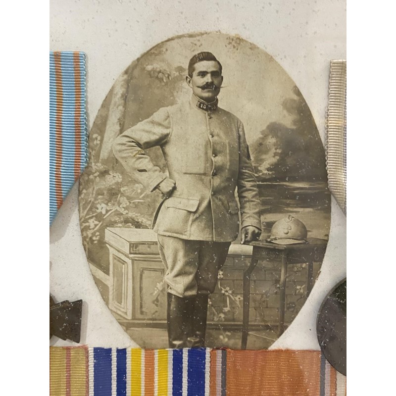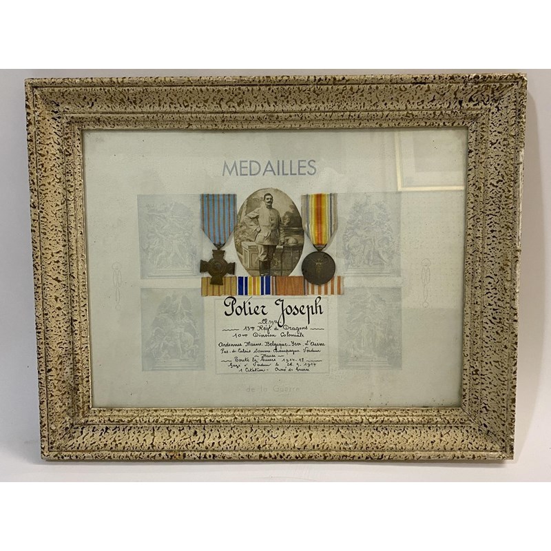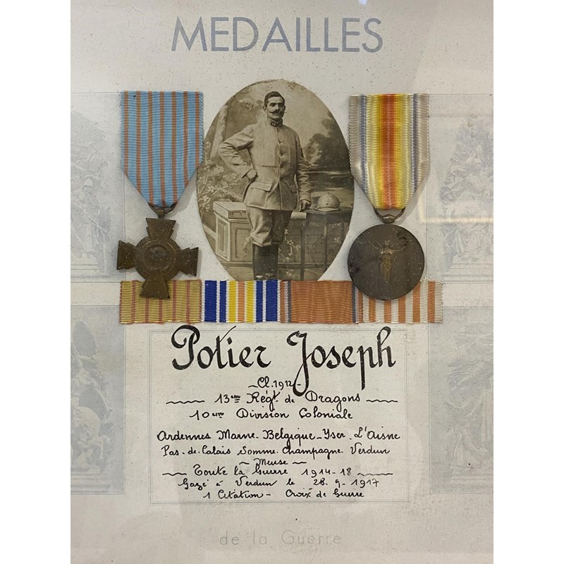 A pair comprising Combatants cross and Victory Medal mounted either side of an image of Joseph Polier of the 13th Regiment of Dragoons, 10th Colonial division, with a list of battles and note that he fought through the entirety of the war and was gassed at Verdun on the 28th September 1917, and of a citation for a Croix de Guerre, framed and glazed, 38 x 48cm, not examined out of the frame.