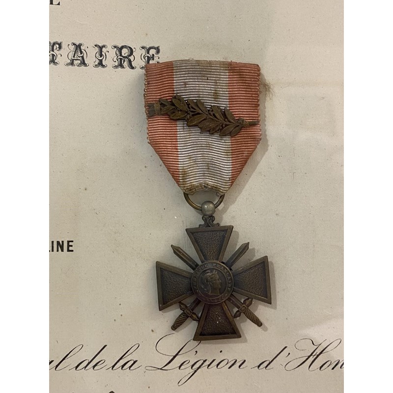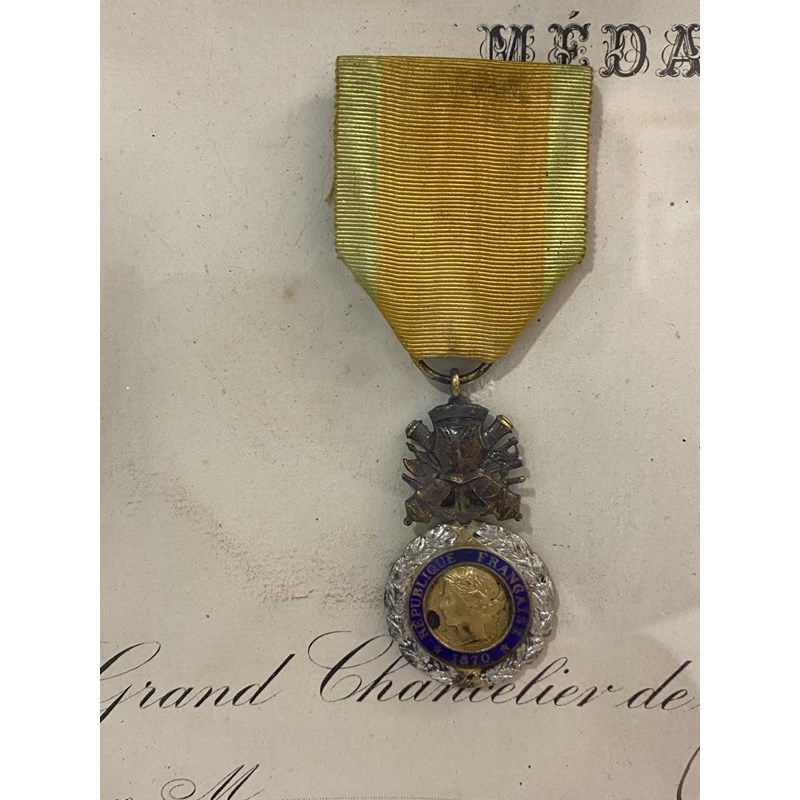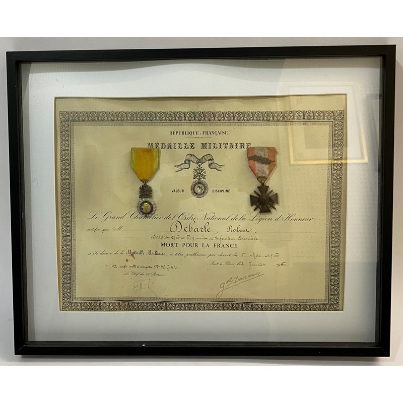 A pair of French medals comprising Military Medal 'Medaille Militaire' with yellow and green ribbon, gilt suspension of cross cannon and medal with blue enamel ring and gilt centre, and a War Cross for operations in foreign theatres with oak leaf to the ribbon, the certificate named to Robert Debarle 'Mort Pour La France' serving with the 21st regiment of the Colonial Infantry, the medal awarded posthumously 5th May 1950. It is likely that this soldier was serving in the region of 'Indo China' possibly as part of the Korean War.