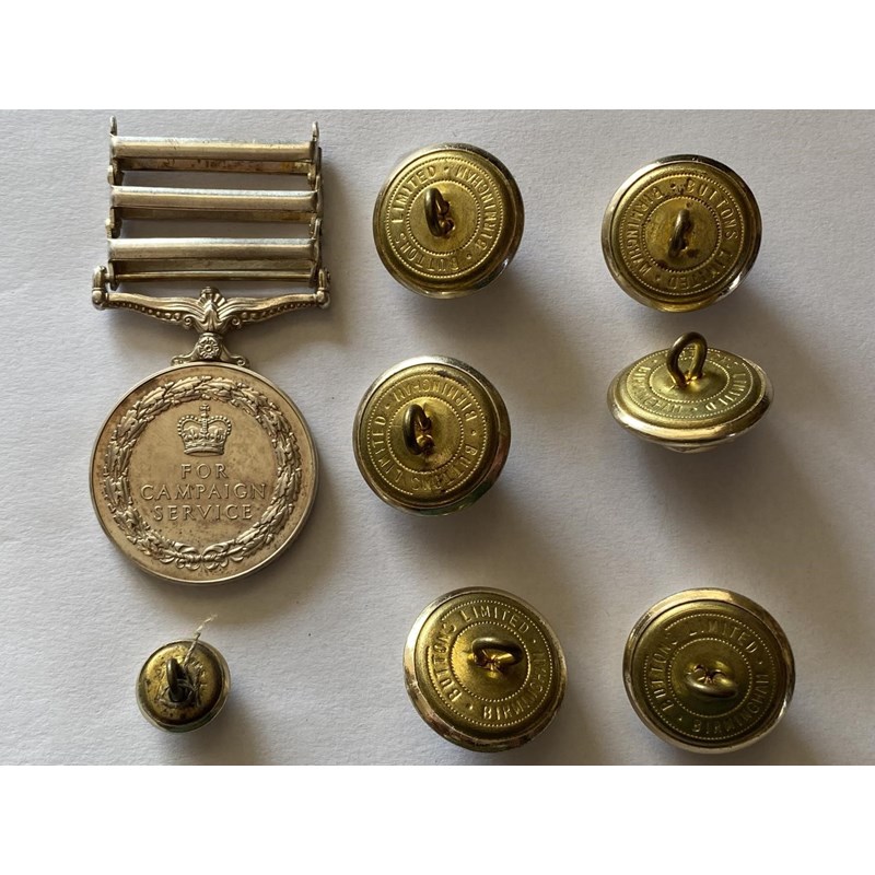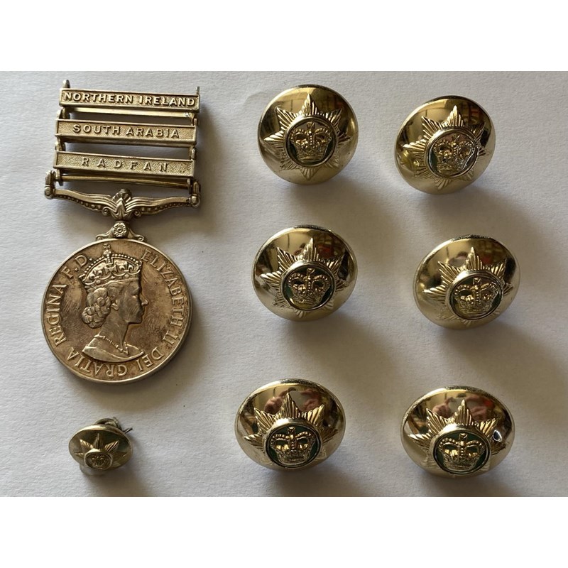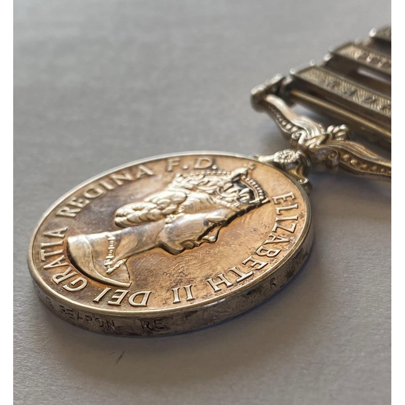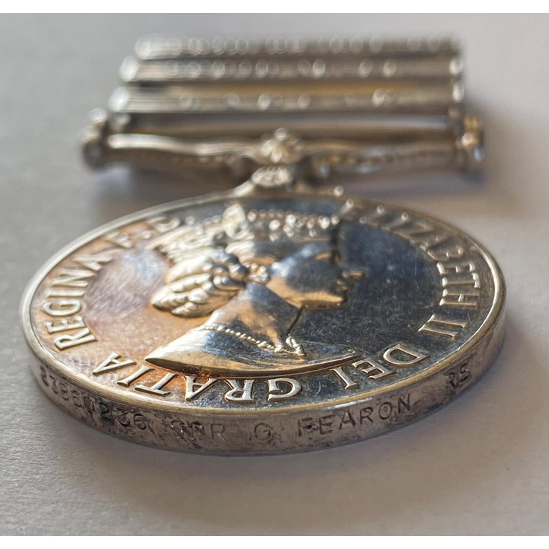 An Elizabeth II General Service medal named to '23860236 SPR G. Fearon R.E. R' with Radfan, South Arabia and Northern Ireland clasps. Lacking ribbon. The 'R' suggesting a replacement medal. With seven buttons.