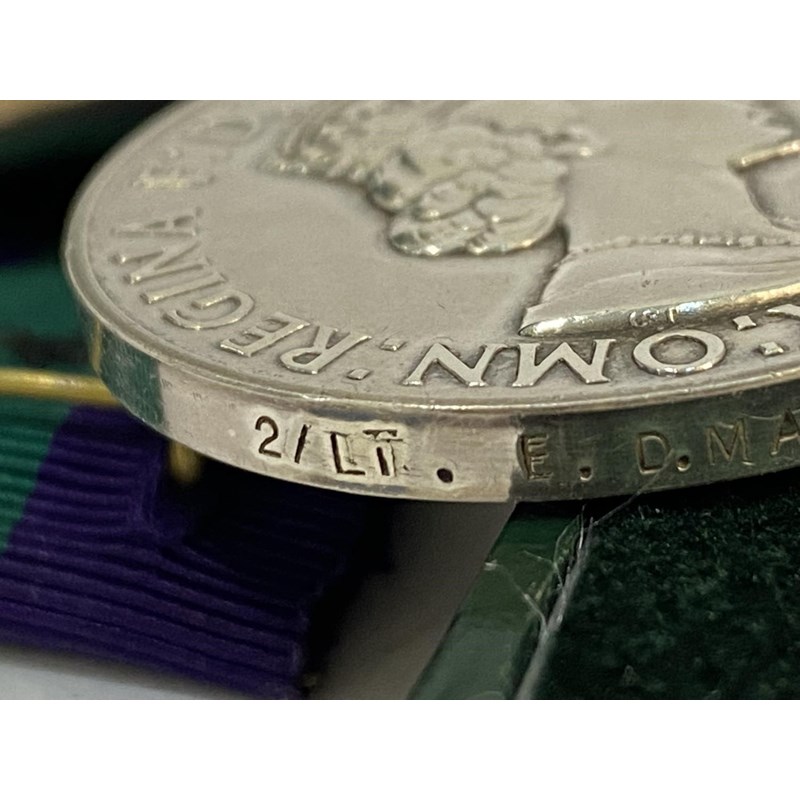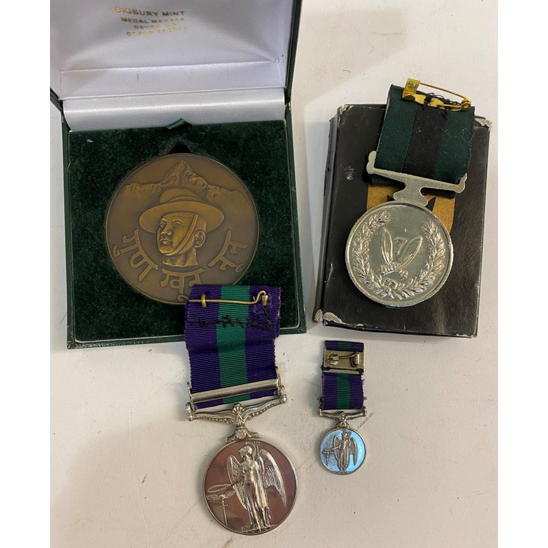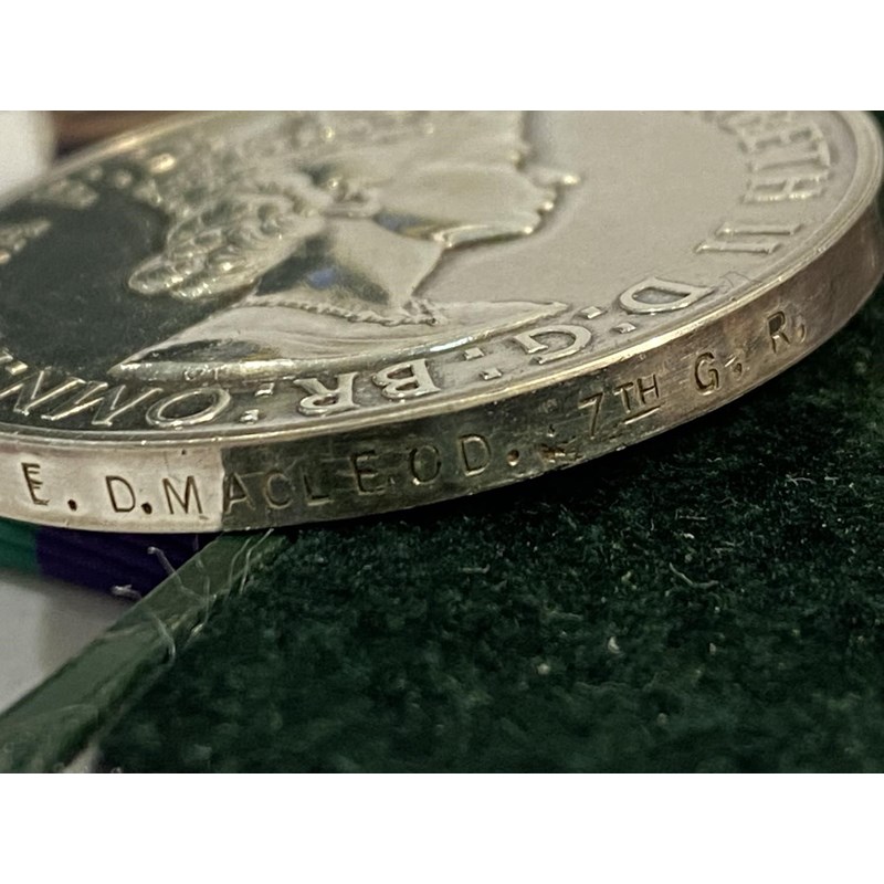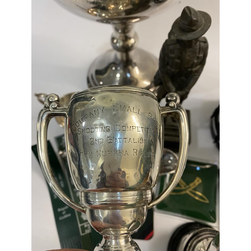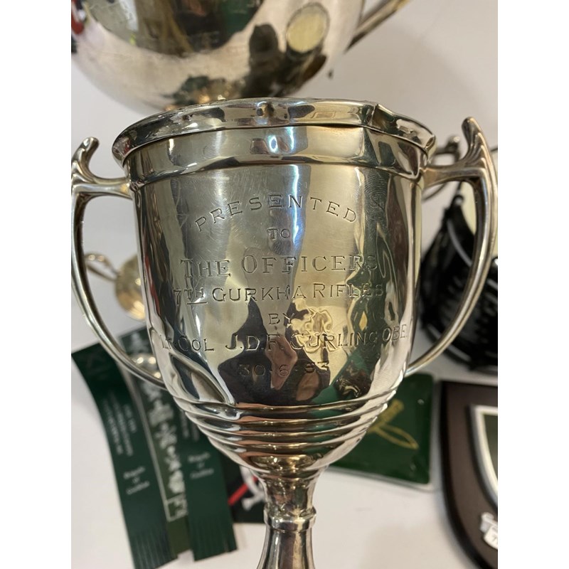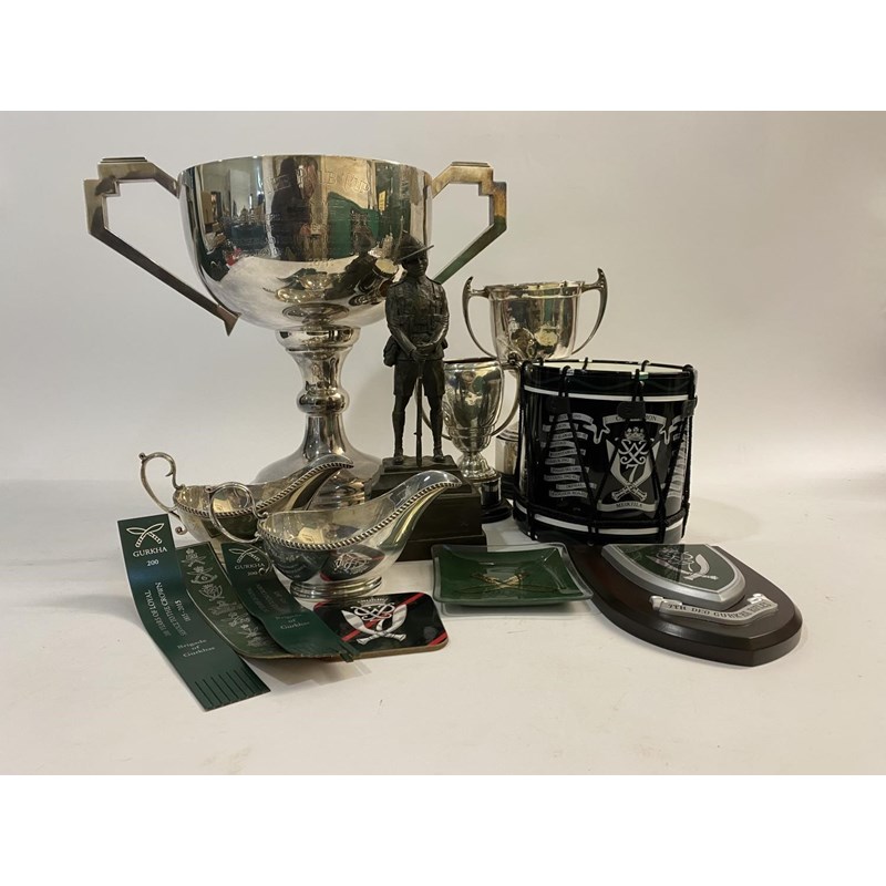 A General Service Medal 1918-1962 with Queen Elizabeth II obverse and Malaya Clasp named to 2/Lt E.D. Macleod 7th G.R., name probably officially corrected, with accompanying miniature, an unofficial 7th Gurkha Durbar Day 28th March 2015 Medal in case of issue, a Bigbury Mint 200 years of Gurkhas service medal in case of issue, a composition statue of a Gurkha '7th Duke of Edinburgh's Own Gurkha Rifles 1902 - 1994', 28cm high. A large presentation trophy cup 'The Raub Cup' 'Presented to the officers and men of the second Battalion of the 7th Gurkha Rifles by the officers and Men of the Raub District Malay Police in appreciation of a year spent as Brothers-in-Arms 1951', E.P.N.S. 37cm high, 43cm wide. The 7th Gurkhas Rifle Cup 'Presented to the Officers 7th Gurkha Rifles by Lt-Col J.D.F. Curling OBE 30.6.53, with presentation inscriptions between 1953-1989' hallmarked for Adie Brothers, Birmingham 1952, 27cm high. A silver shooting cup: 'The Company Small Bore Shooting Competition 2nd Battalion 7th Gurkha Rifles, Presented by Lt Col J.H. Alford' with presentation inscriptions between 1953 - 1967, hallmarked for Adie Brothers, Birmingham 1950, 17.5cm high. Two plated sauce boats with 7th Gurkha crest and other related items.