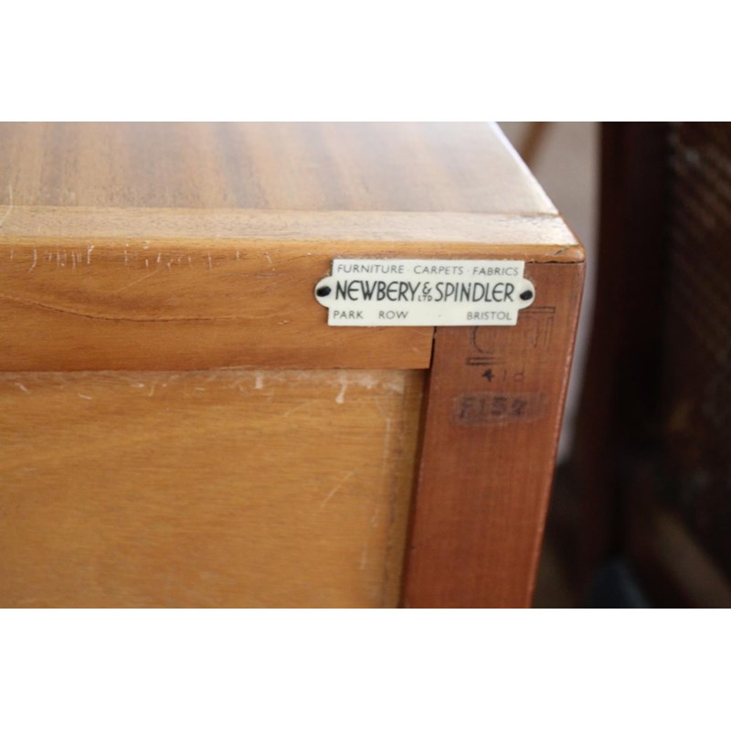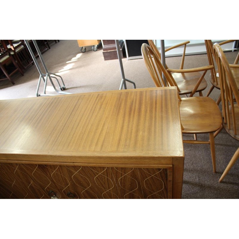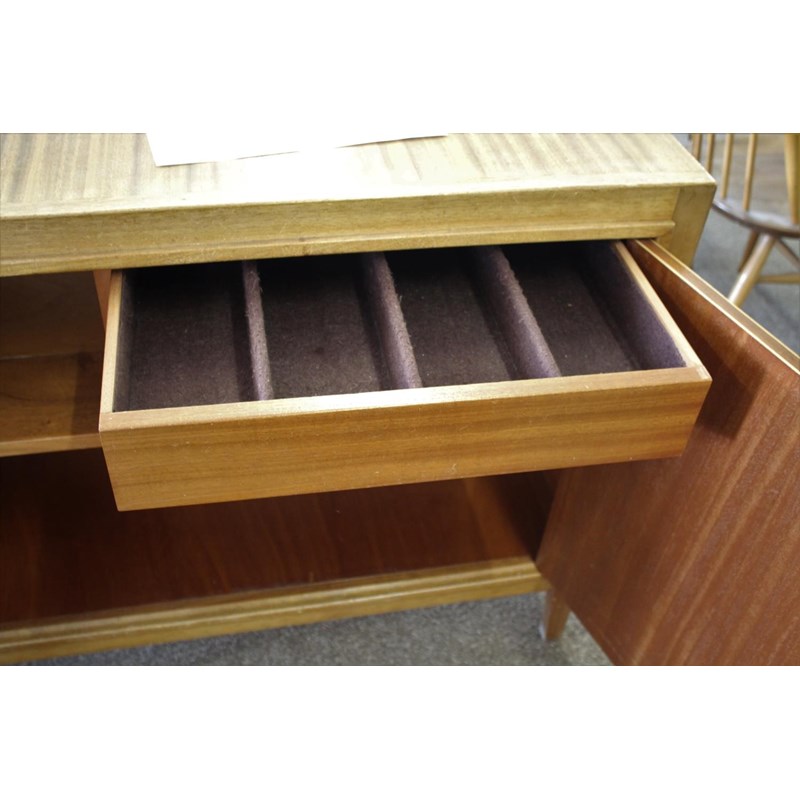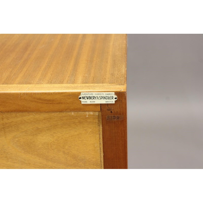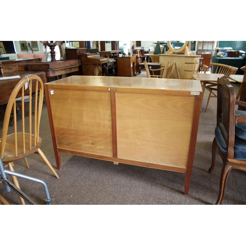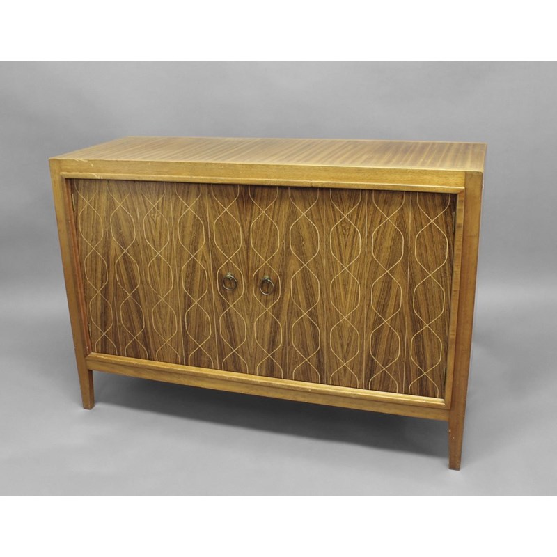 designed by David Booth and Judith Ledeboer in 1953, made in mahogany and veneered in Bombay rosewood, cut to reveal white birch. With internal drawer and shelf, and with plaques for Gordon Russell, Broadway, and retailers plaque for Newbery & Spindler, Bristol. 121cms across, 84cms high