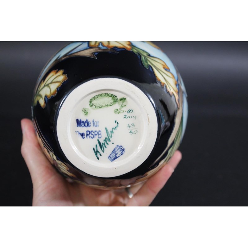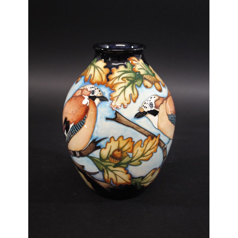 a limited edition vase made for the RSPB, in the Jays at home design and designed by Kerri Goodwin. No 43 of 50 made. Marked, Moorcroft, England, 2014, 43/50, Made for the RSPB, and signed by Kerri Goodwin. 21cms high
